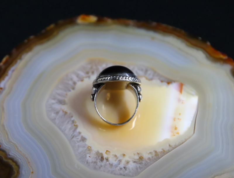 また、9~9.5号程度というサイズは女性にお勧めですが、黒い石の放つ妖しくもクラシックな雰囲気は、男性のピンキーリングにもフィットします。性別や季節、スタイルを問わずモードなスタイルにもコーディネイト可能なスペシャリティを持ったリングです。