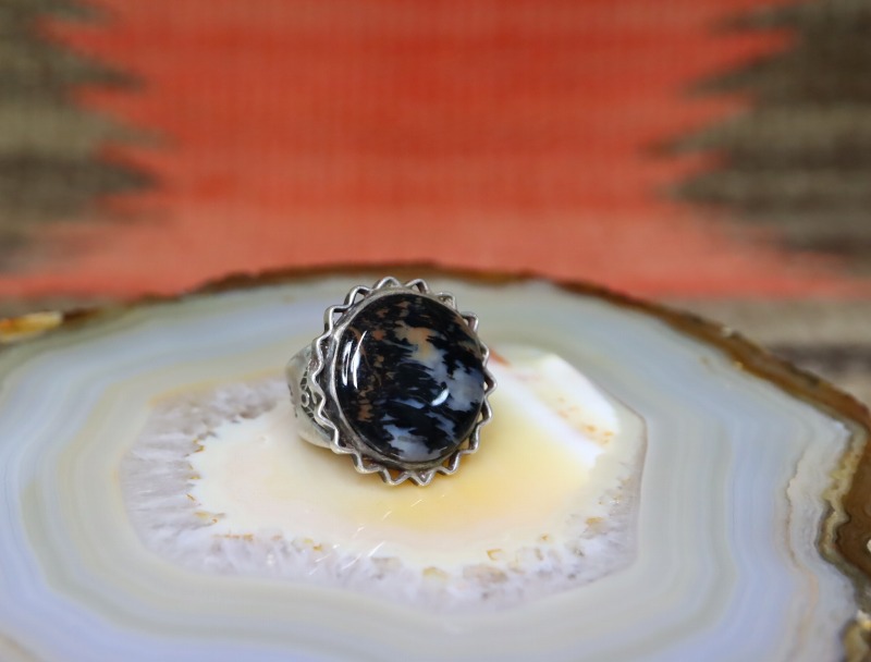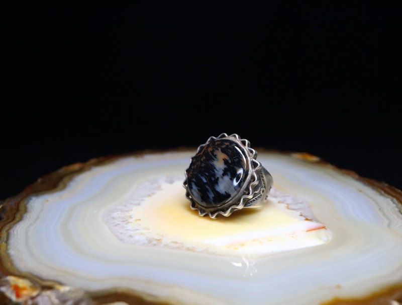 本作もそんなペトリファイドウッドをメインに構成した作品であり、とてもシックで神秘的な美しさを持つペトリファイドウッドと、繊細でオーセンティックなシルバーワークによって独特な存在感を示すリングに仕上げられています。