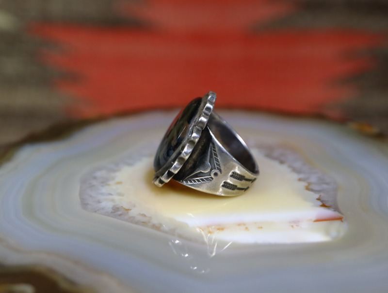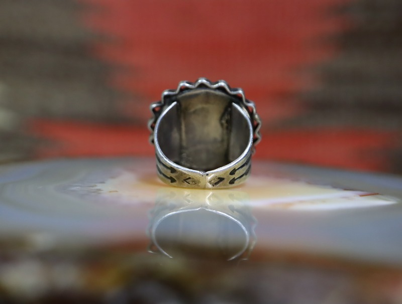 シャンクは、フロントに向けて広くなるシェイプにより、ボリューム感のあるフェイスと呼応した美しい造形。そのフェイスはラウンドカットの美しいペトリファイドウッドがメインに構成され、クラシックな印象の造形スタイルとなっています。そして、その石を留めるベゼル(覆輪)の外側には、ジグザグのシルバーワークが配されることで石の淵にリズムと奥行きを生み出しており、とても効果的で特徴的なディテールとなっています。このようなディテールは『Crimped Wire』クリンプトワイヤー(波型をつけたワイヤー)とも呼ばれ、その発祥は不明となっていますが、1930年代以前からみられる造形スタイルの一つで、ナバホの偉大な作家【Fred Peshlakai】フレッド・ぺシュラカイ(1896-1974)や、ホピの【Ralph Tawangyawma】ラルフ・タワンギャウマ(1894-1972)も好んだディテールです。