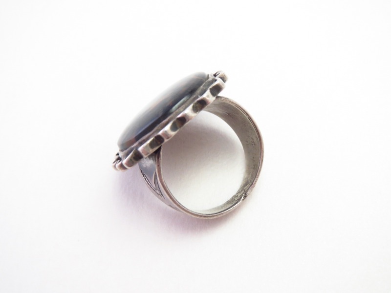 全て伝統的な技術によって形作られた作品ですが、ベゼルを囲む繊細なクリンプトワイヤーが、そのつなぎ目が確認できないほど丁寧なロウ付けによって接着されていたり、とても質の高いハンドメイドのスタンプ(鏨)ツール等からは、作者の卓越した技術力が伺えるリングです。