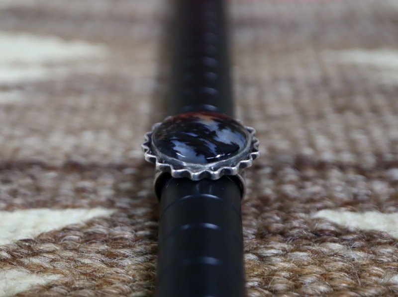 こちらの作品にセットされたPetrifiedWoodもインディアン居留地に近い場所(アリゾナ州)で産出したものと思われます。 強い透明感を持ったグレーとブラックをベースに、ナチュラルなオレンジが入り、複雑な景色を形成しています。ダークカラーを基調としながら、深淵な奥行きを持つ表情は、どこか妖艶な印象も与えます。
