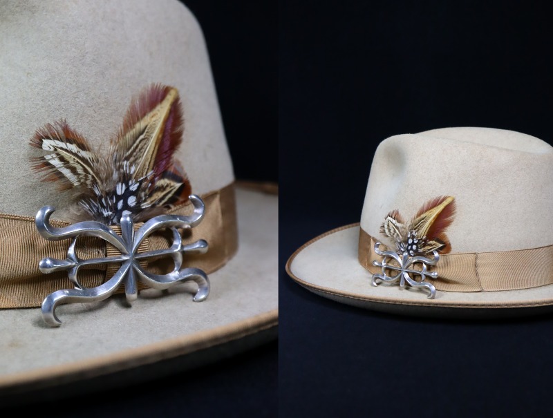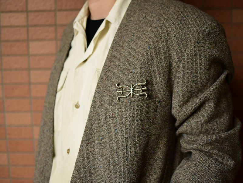 また本作では、丁寧なシルバーワークと卓越した立体造形センスによって、シンプルながら現代作品にはない威厳のある表情が与えられています。さらに、シルバーのみで構成されたソリッドな印象やクラシックでオーセンティックなシェイプは、多くのアイテムにさり気なくフィットし、使いやすいピンブローチとなっています。ラペルやハット以外にも多くのアイテムに馴染みやすく、日常のスタイルにおいてとても良いアクセントになってくれるアイテムです。