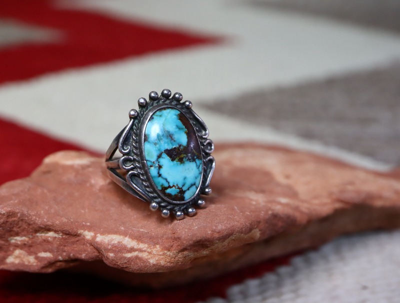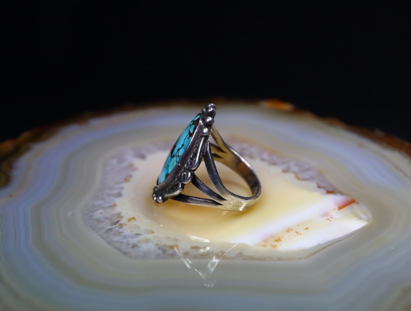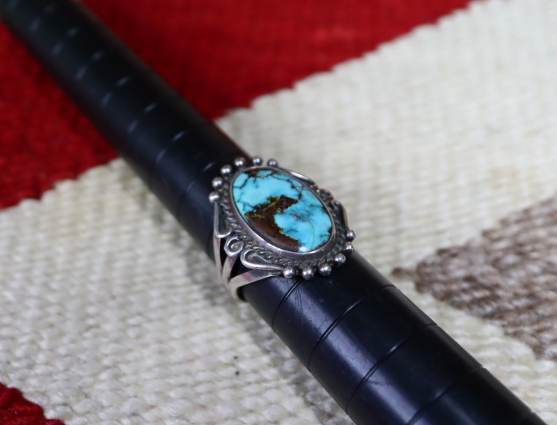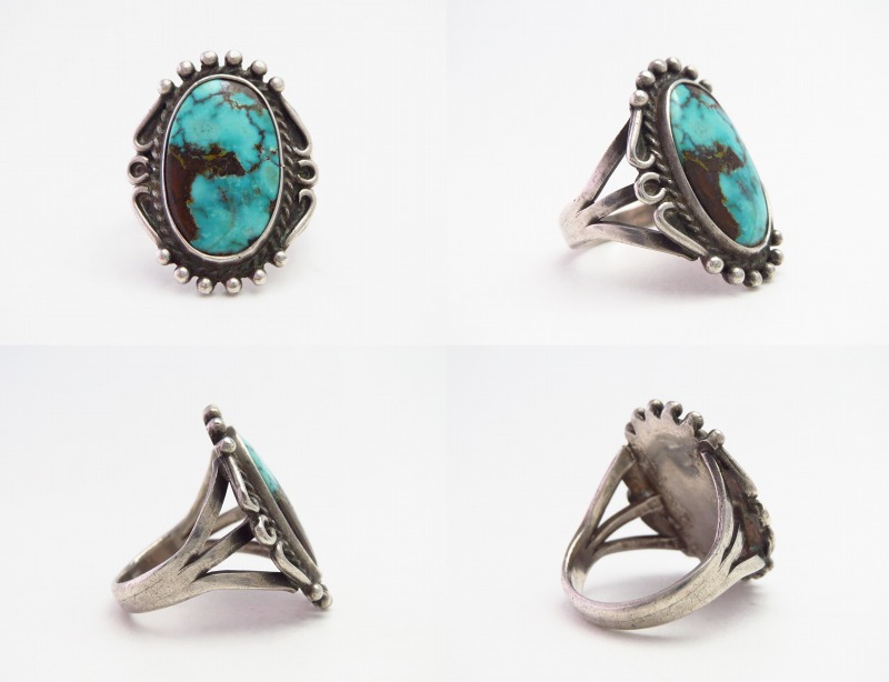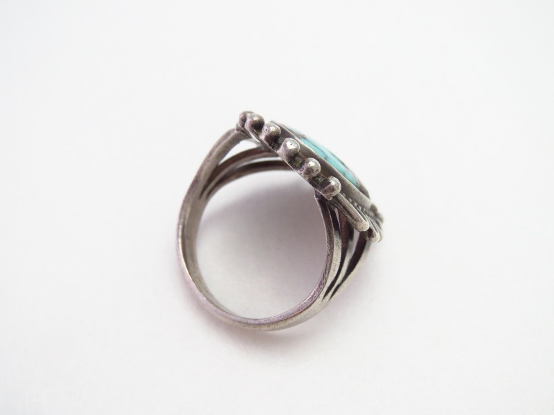 伝統的な造形スタイルやプリミティブな彫金技法で構成されたオーセンティックなシルバーワークの作品ですが、細部には作者の拘りが詰まっており、ワイルドで美しいロイストンターコイズとの調和とコントラストが素晴らしいリング。手の込んだシルバーワークにより、特別な完成度や奥行きを感じさせ、ジュエリーとしての品位とビンテージインディアンジュエリー特有のアーシーな雰囲気を併せ持っています。