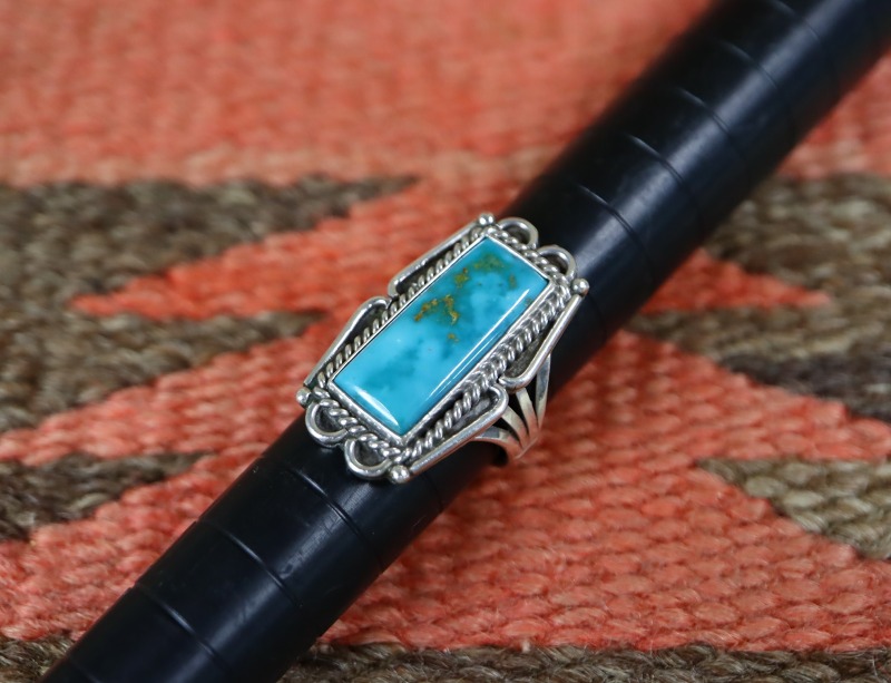 【NAVAJO】ナバホのビンテージジュエリー、オーセンティックでクリーンなデザインをベースに、レクタングラー/長方形シェイプにカットされた美しいフォックスターコイズがマウントされた作品。とても丁寧で高い完成度を誇るシルバーワークも特徴的なアンティーク/ビンテージリングです。