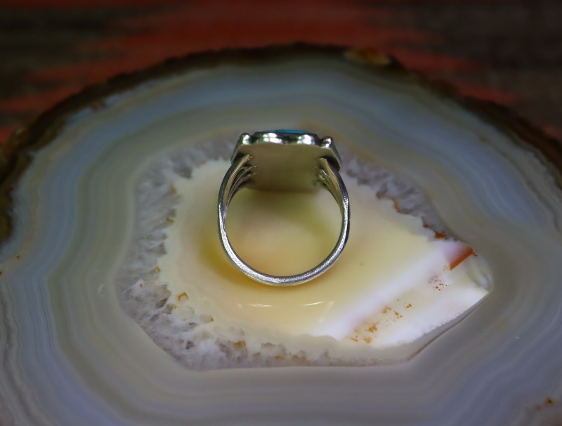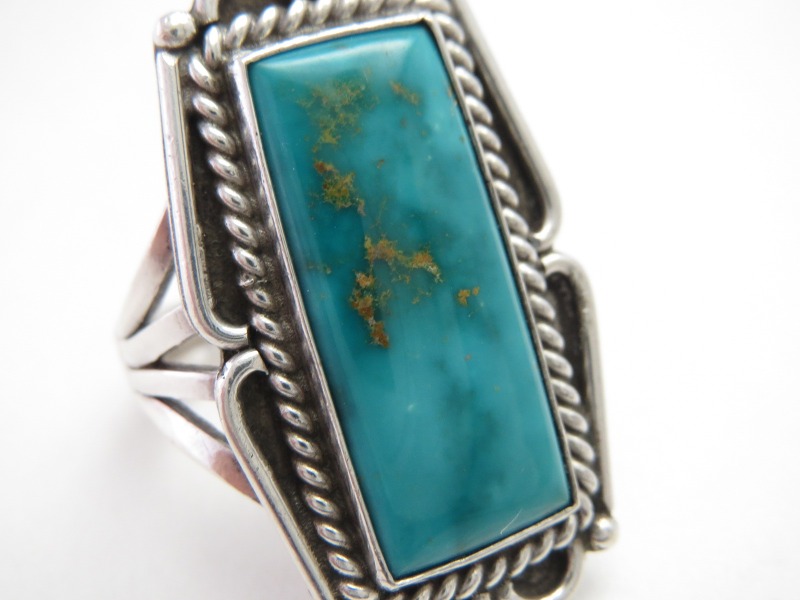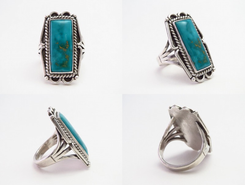 レクタングラーシェイプにカットされたターコイズによってクラシックでエレガントな印象も併せ持つリングであり、性別を問わずコーディネイトのスパイスとなり得るリング。ラフなスタイルだけでなくフォーマルなシーンでも品格を損なわず、普遍的な造形美は多くのスタイルにフィットすると思われます。