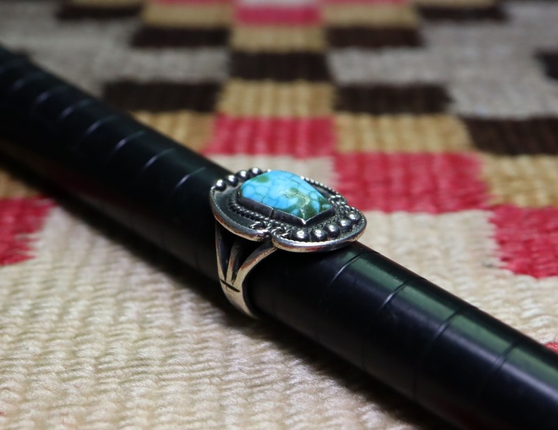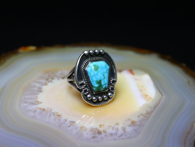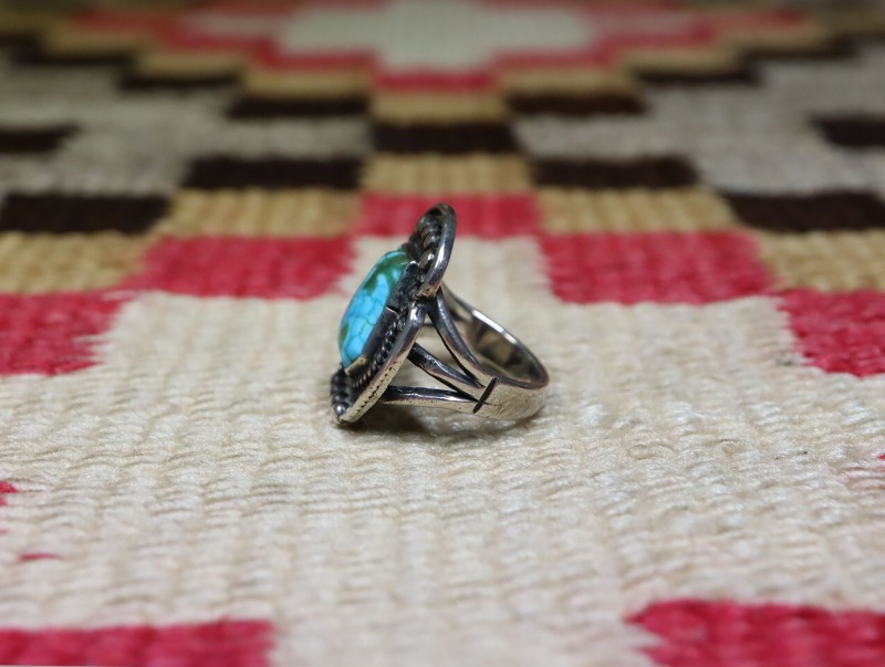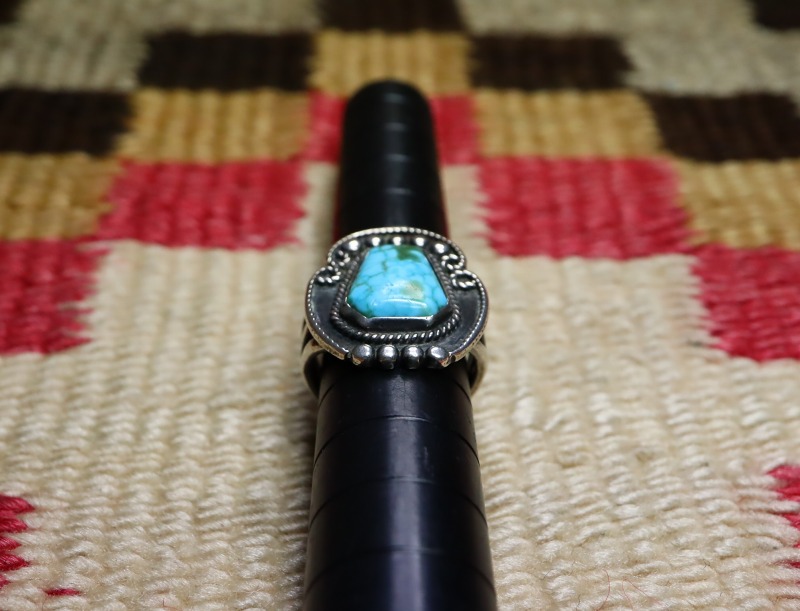 【NAVAJO】ナバホのアンティークジュエリー、とても丁寧で手の込んだシルバーワークによって作られた作品。珍しいコフィンシェイプにカットされた、質の高いナンバーエイトターコイズが印象的なアンティーク/ビンテージリングです。