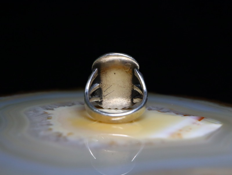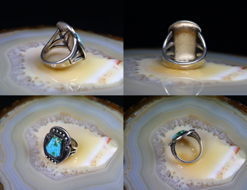 おそらくインゴットシルバー(銀塊)から成形されたシャンクは、フロントが『スプリットシャンク』と呼ばれる伝統的な造形で3本に割り開かれており、フェイスに向けて自然な流れを生み出しています。フェイスは独特なシルエットに造形され、そこにコフィンシェイプ(棺桶型)にカットされたナンバーエイトターコイズがマウントされています。その石を留めるベゼル(覆輪)の外周と、フェイスのエッジを縁取るように配されたツイステッドワイヤーにより、石の周囲に影が生み出される事でターコイズの美しさを際立たせています。