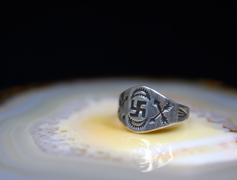 1920年代後半~1930年代に作られた作品で、センターが広く内側が細いシャンクの造形は『シガーバンドリング』とも呼ばれるクラシックなシェイプ。フェイスは、力強く刻印された逆卍がメインに構成され、その両サイドにはクロスアローズのスタンプが刻まれています。また、その周囲にもプリミティブなスタンプワークが配されることで奥行きが与えられ、ビンテージインディアンジュエリーらしく素朴でエスニシティな印象に仕上げられています。
