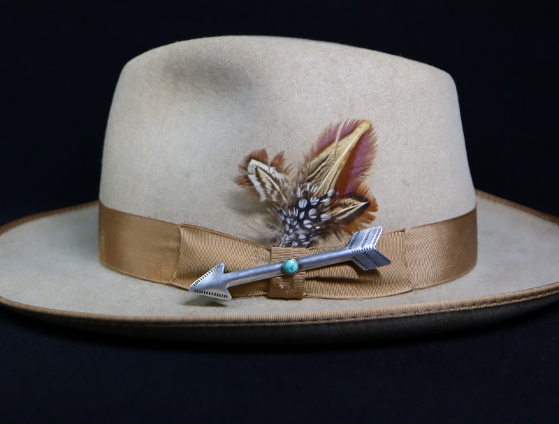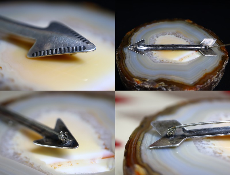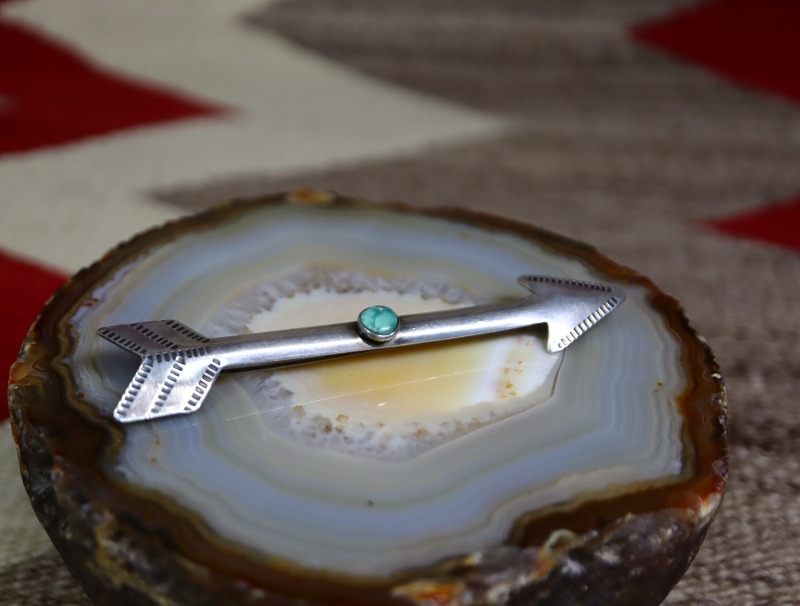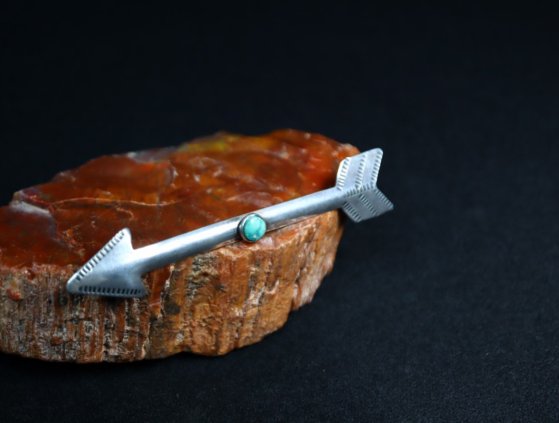1940年代~1950年代頃のピースと思われ、ツーリストジュエリーらしいデザイン/造形のピースですが、ツーリストジュエリーやフレッド・ハービースタイルを代表するアローシェイプをベースに、シンプルで素朴なスタンプワークが刻まれ、中央には小さなラウンドカットターコイズがセットされています。さらに、全体にハンマーワークによるアール/曲面が施されることで、立体的なアローが作り上げられており、それによって奥行きと上質感、そして素晴らしい存在感が与えられているようです。