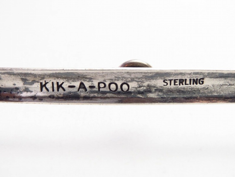 現在のKickapooとこちらの刻印KIK-A-POOの綴りが異なっているのは、インディアンが文字を持たない事に起因しています。ミッドセンチュリー以前には、個人名も発音だけを元にしたアルファベットの綴りとなっていました。その為、時代により名前の綴りが変わることは珍しい事ではなく、現在では正確な発音が不明となってしまった人物も数多く存在しています。また、推測ではありますが、PEEK-A-BOO(いないいないばぁ)をモジってKIK-A-POOと表記した可能性も考えられます。