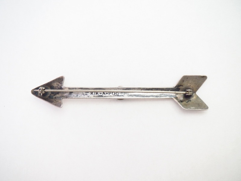 【Tourist Jewelry】ツーリストジュエリーや【Fred Harvey Style】フレッド・ハービースタイルと呼ばれる、20世紀前半頃にアメリカ中西部の観光客向けに制作されたスーベニアアイテム(土産物)の一つ。中でも内側に「KIK-A-POO」の刻印が入ることで、【Kickapoo】キカプー族のシルバースミスによって作られた事が判断可能なピース。大きいアローシェイプをベースに、シンプルなスタンプワークと中央にマウントされたターコイズによって構成されたアンティーク/ビンテージピンブローチです。