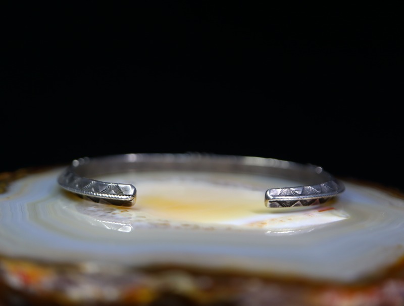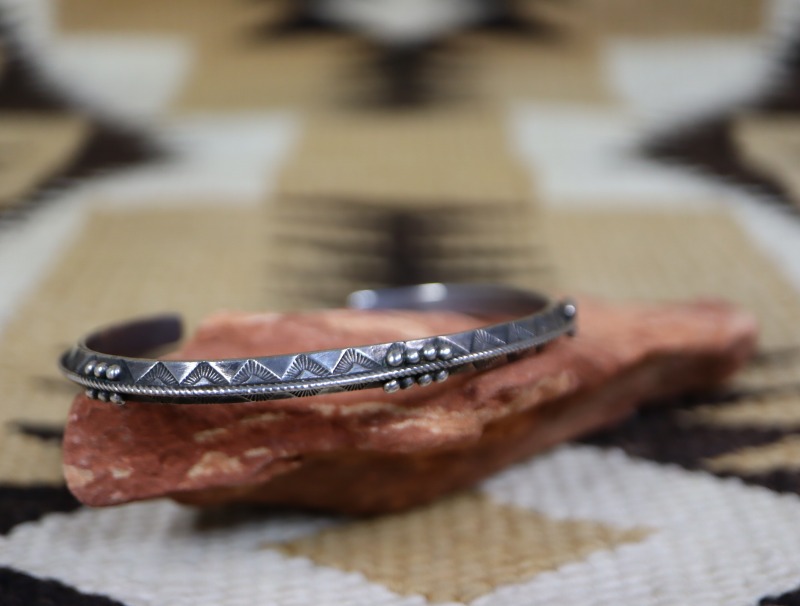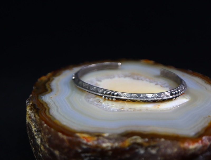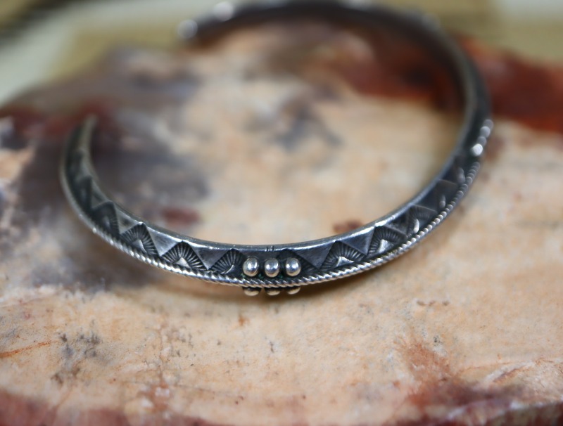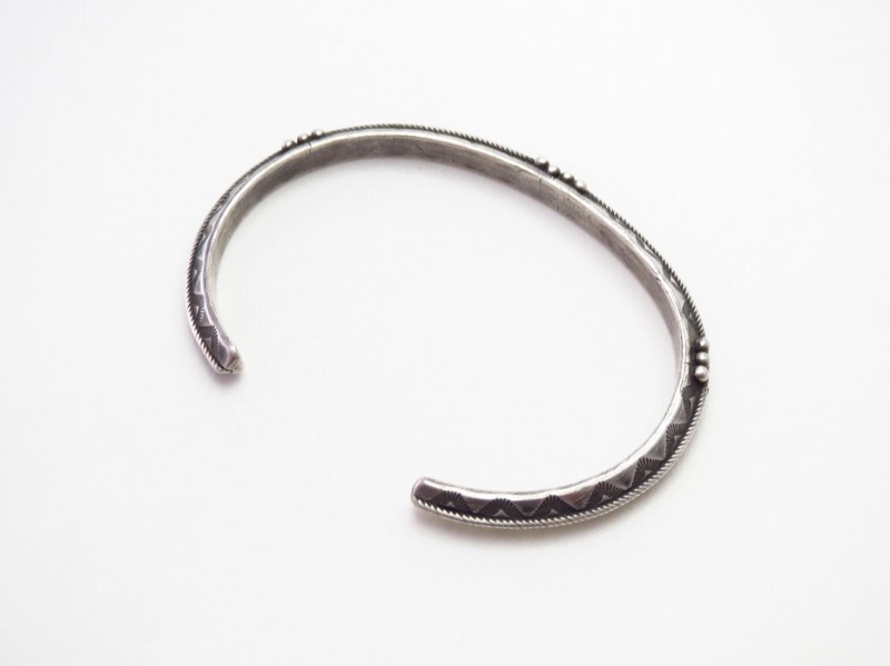 トライアングルワイヤーには全体にシンプルなスタンプワークが刻まれ、トライアングルの上下で対称の文様が刻印されることで、ナバホジュエリーらしい表情が与えられています。また、それらで使用されているスタンプ(鏨)ツール自体も力強く原始的でありながら、アンティーク作品特有のクオリティーを有する高い完成度を誇っています。