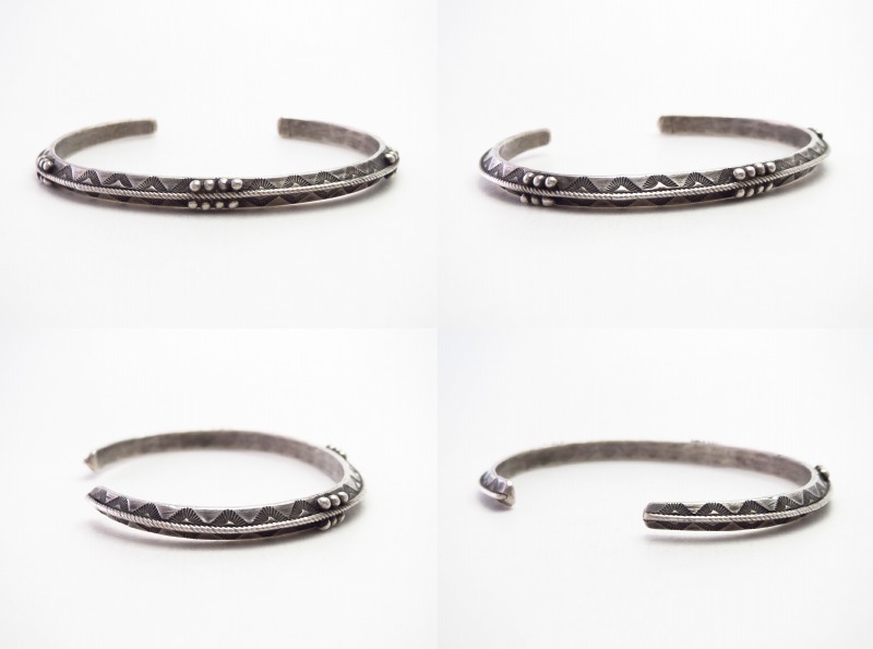 1920年代末頃~1940年代頃に制作された作品と思われ、プリミティブな技術によって形作られた武骨な質感と、伝統的な造形で構成されながら突出したオリジナリティと造形センスを感じさせ、ハイエンドでとても魅力的なブレスレットとなっています。