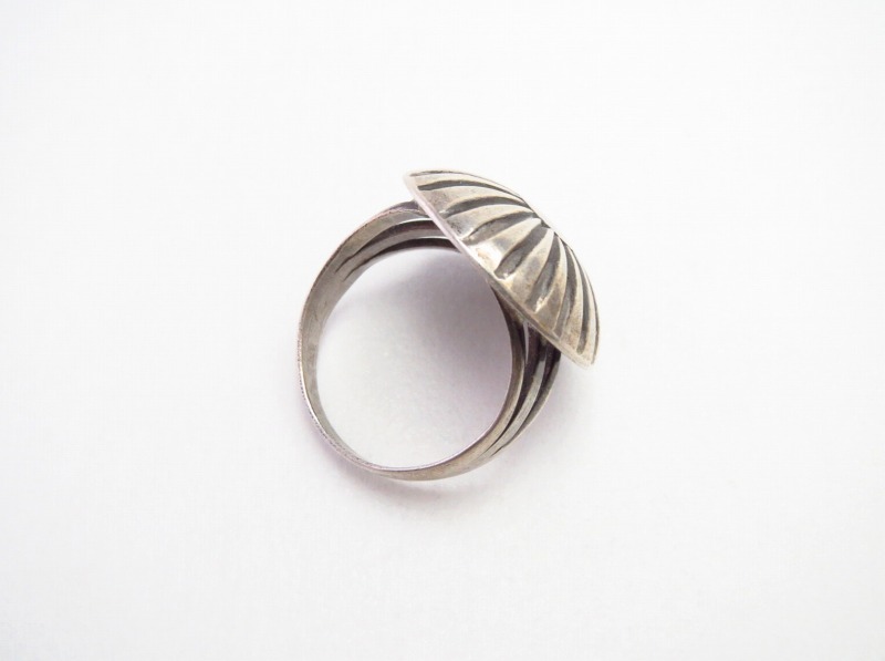 1930年代後半~1950年代頃に制作されたと思われ、Hollow Style/ホロウスタイルと呼ばれる中空構造で形作られたコンチョがフェイスに構成され、ぽってりとした丸いフォルムが印象的なピース。ユニークで可愛いフォルムながら、着用した印象はオーセンティックでクラシックな雰囲気を持つリングとなっています。