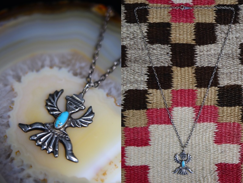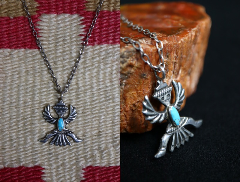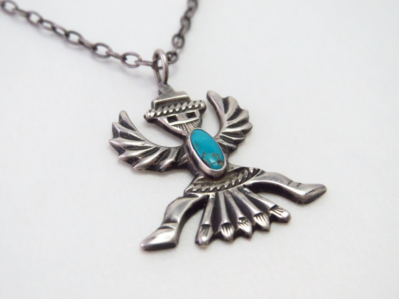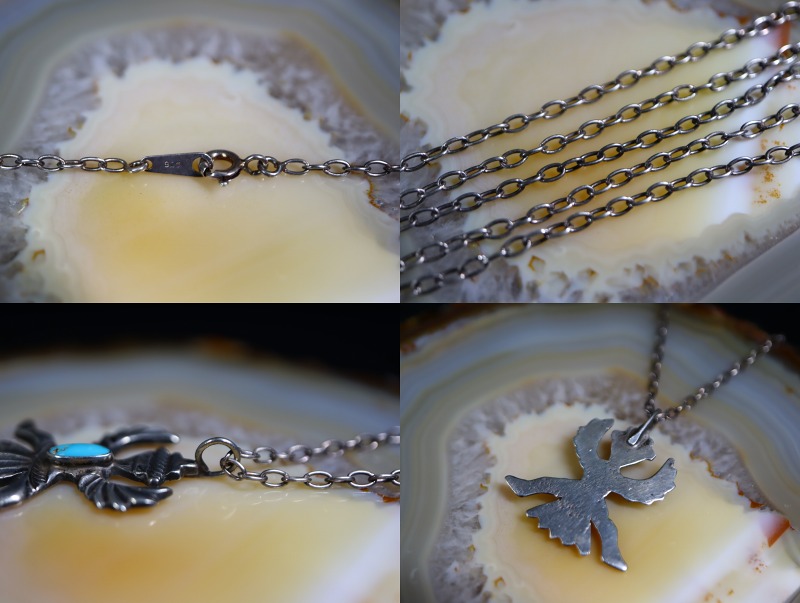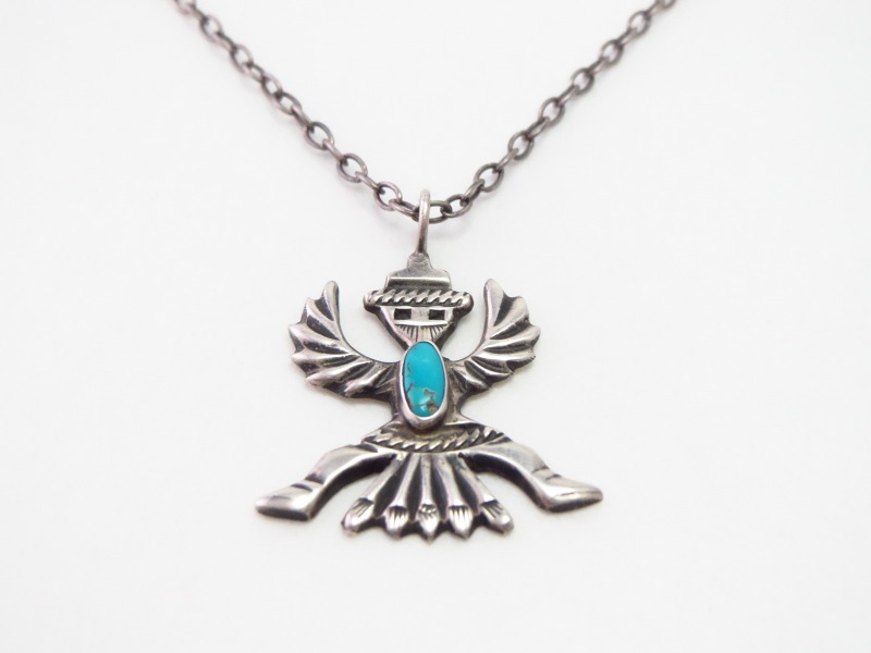 【ZUNI】ズニの偉大な作家【Horace Iule (Aiuli)】ホレス・イウレ(1899~1901?-1978)の作品と推定可能なアンティーク/ビンテージネックレス。ズニ族にとって戦いの神である精霊『Knifewing/ナイフウイング』は、同作者がインディアンジュエリーに取り込んだモチーフとされており、小さなサイズのトップながら、スタンプワーク等を含め非常に質の高いシルバーワークも特徴的な作品となっています。