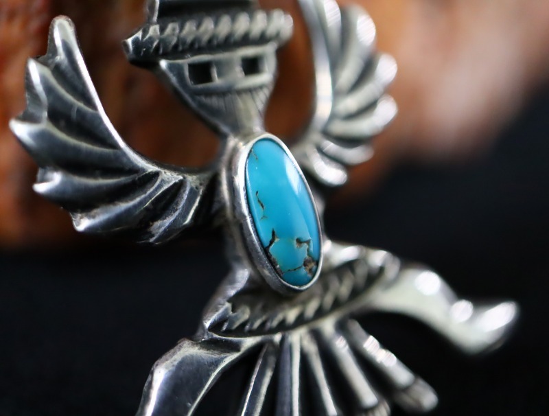 1930年代後半~1950年代前半頃に作られた作品と思われ、現在のズニジュエリーでは例外的な技術である、サンドキャスト(砂型鋳物)で成形されたトップは小さいサイズですが、ナイフウイングの動きのある造形が秀逸で、上質感と迫力さえも感じさせるシルバーワークによって形作られています。
