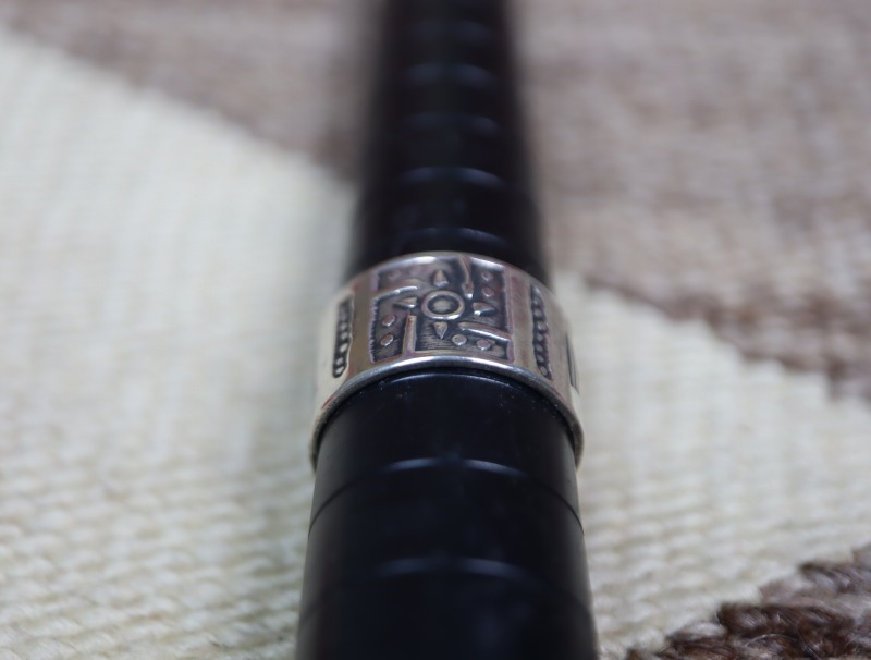 そして、そのフロントには大きく力強い卍のスタンプが刻まれ、サイド~バック部分にはアローとトマホーク(手斧)がクロスした珍しい構成の刻印が施されており、ロウ付け等の細かなディテールには粗暴な部分が見られますが、それもプリミティブな印象を生み出し、オールドピース特有の表情や量産されたツーリストジュエリーにはない威厳のある質感を作り出しているようです。