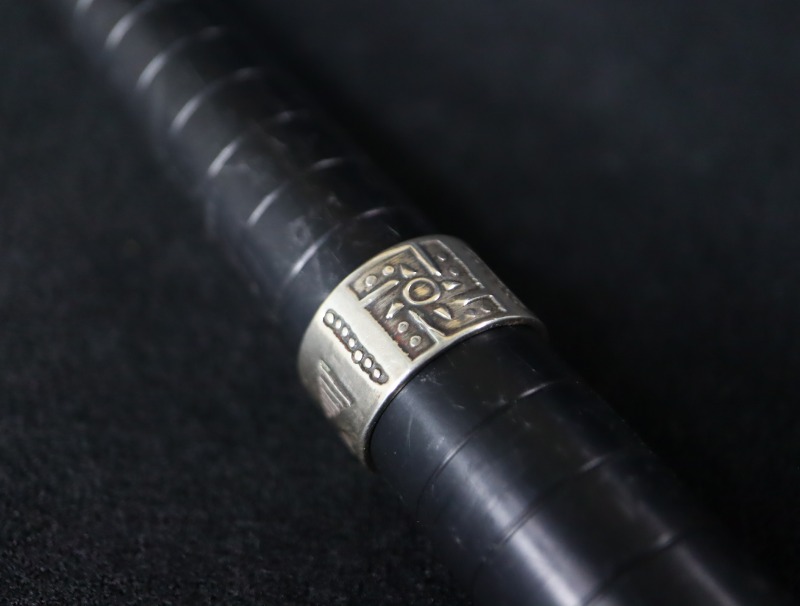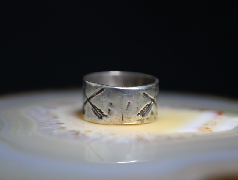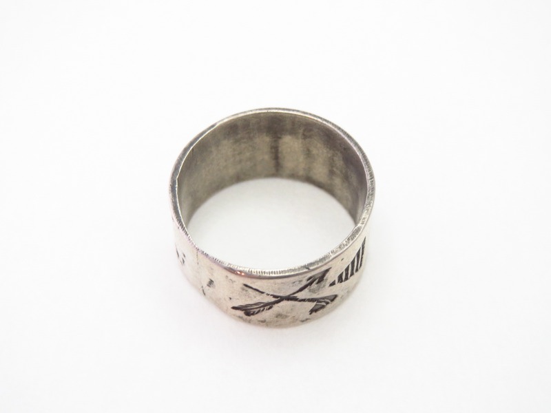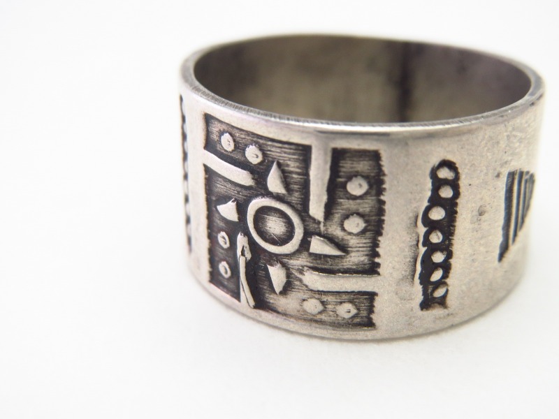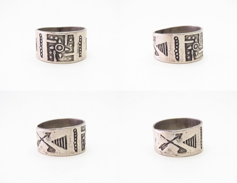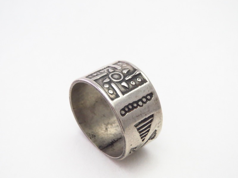 【Fred Harvey Style】フレッド・ハービースタイルや【Tourist Jewelry】ツーリストジュエリーと呼ばれる、20世紀前半頃にアメリカ中西部の観光客向けに制作された初期スーベニアアイテム(土産物)の一つ。『バンドリング』とも呼ばれる造形スタイルをベースに【卍】Whirling Log/Nohokos等のスタンプワークが施された武骨なアンティーク/ビンテージリングです。