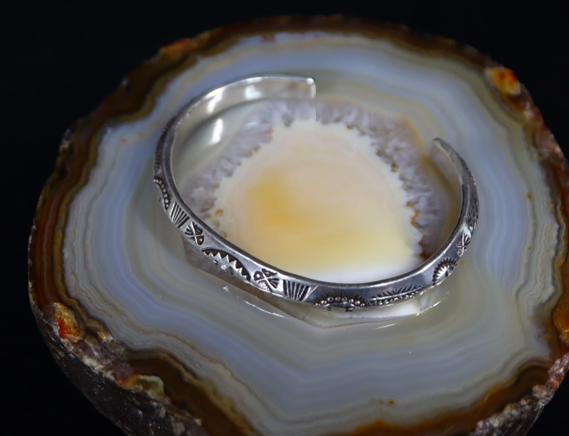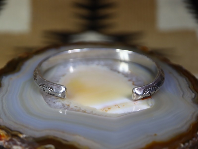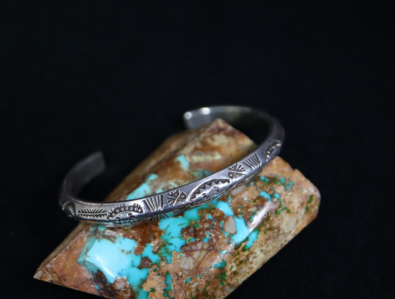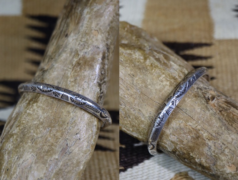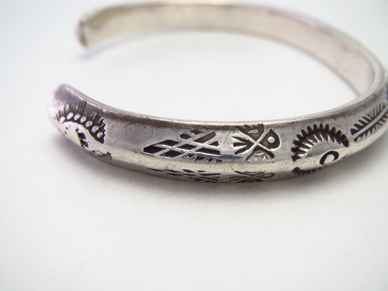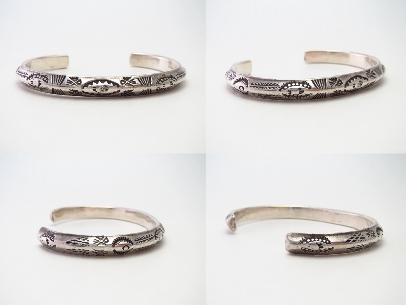 さらに、上下対称にビンテージナバホらしいスタンプワークが施されており、フロントとサイドの合計4か所にサンダーバードの刻印が刻まれています。また、ターミナル(バングルの端)のエッジは丸く鞣されています。これらの製法や造形スタイルからは、ツーリストジュエリーの中でも古い作品と推測する事が出来ます。