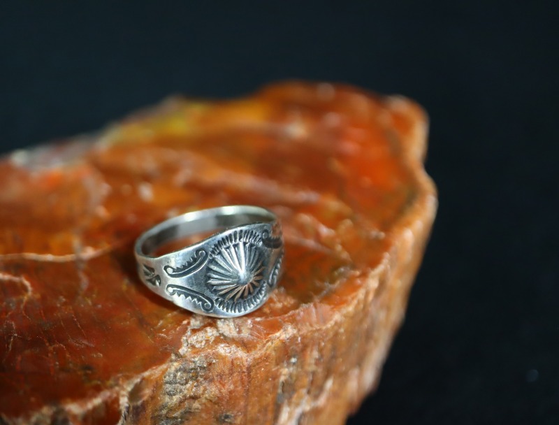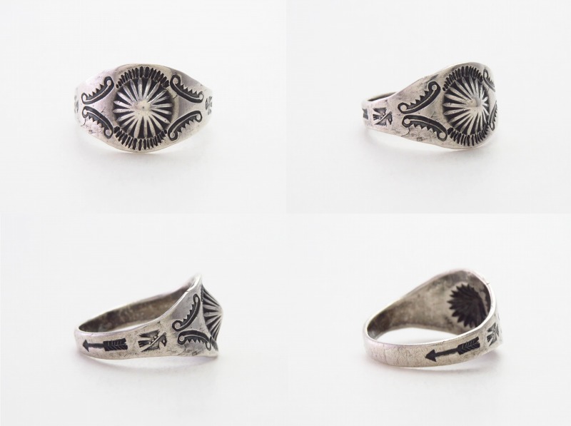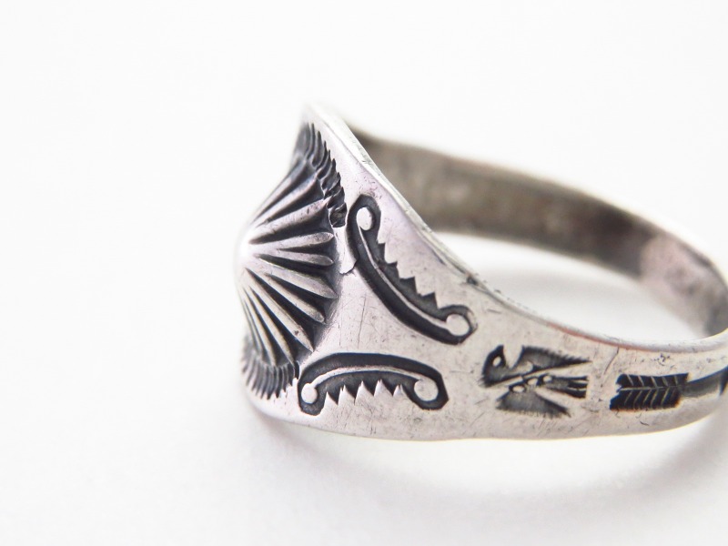 【NAVAJO】ナバホのアンティークジュエリー、インゴットシルバー(銀塊)から成形されたシャンク/地金をベースとしていることが判断可能なリングでは珍しい作品で、オーセンティックなシガーバンドシェイプのアンティーク/ビンテージリング。フロントのシェルコンチョをモチーフとしたリポウズ/バンプアウトがメインに構成され、サイドにはさりげなくも効果的なアンダーバードやアローのスタンプワークが刻まれた作品です。