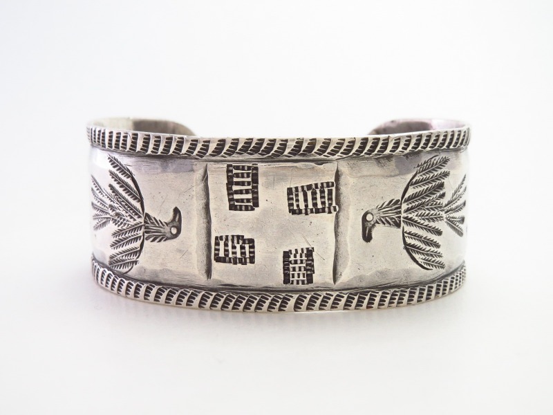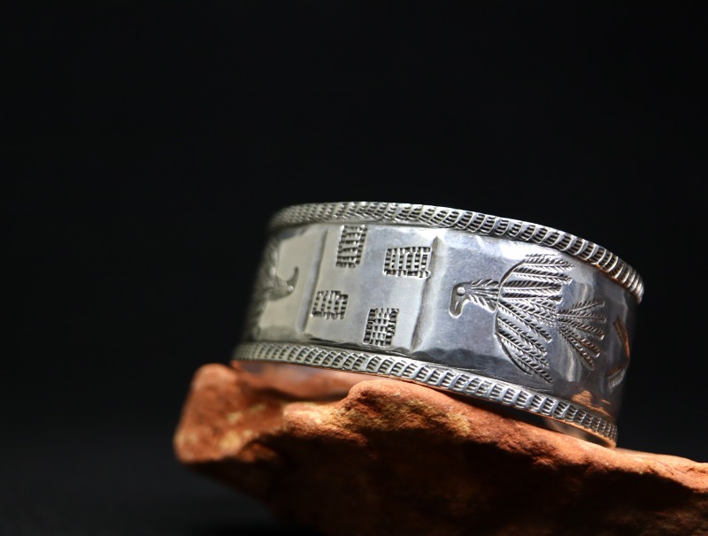 【NAVAJO】ナバホのアンティークジュエリー、インゴットシルバー(銀塊)から成形された重厚なバンド/地金に【逆卍】Whirling Log/Nohokosやサンダーバードのスタンプワークが刻まれ、ナバホジュエリーの武骨な味わいとプリミティブな魅力の詰まった作品。非常に貴重な初期のツーリストジュエリーであり、内側に当時のステッカー(ラベル)が残るコンディションにも、スペシャリティを持ったアンティーク/ビンテージバングルです。