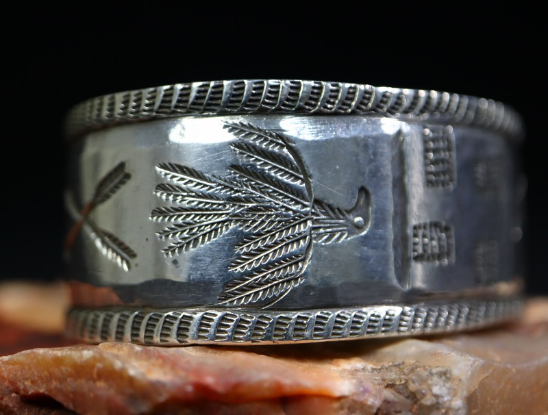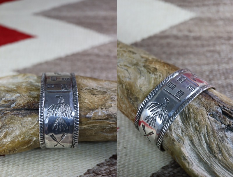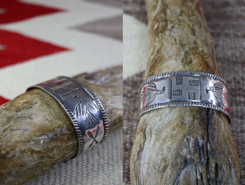 そして、全体にクオリティの高いスタンプ(鏨)によって象徴的な文様が刻まれています。フロントには、素朴なスタンプ(鏨)を重ねて打刻し、前述のChasing/チェイシングと組み合わせることで、大きく逆卍が描き出され、そのサイドにも大胆にデザインされたサンダーバードが配されています。それは、イーグルの様なサンダーバードの頭部とフェザーをモチーフとしたスタンプを巧みに重ね合わせる事で構成され、スタンプ(鏨)ツールの質のみならず強いオリジナリティを感じさせる造形となっています。両サイド部分には大きくクロスドアローズが刻印され、細かな文様よりも大きく象徴的なモチーフを並べたデザインが好印象なバングルとなっています。