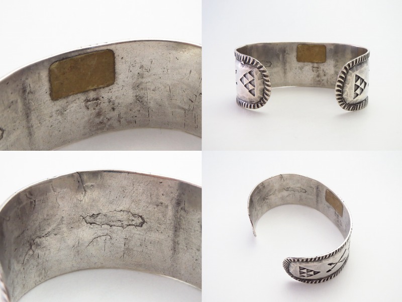 本作の内側に見られるような、インゴットシルバー成形特有のひび割れの様な部分は『インゴットシルバーのマーク/記』とも呼ばれ、アンティークジュエリーマーケットにおいては重視されるディテールです。ナバホの古典的な技術によって形作られている事を示し、素朴で古拙の美を持った作品群の特徴ともいえます。