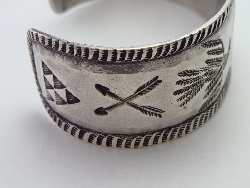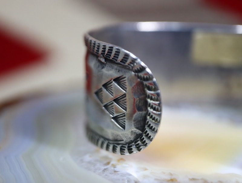 そこに『Chasing/チェイシング』と呼ばれる鏨を使いシルバーに立体的な角度を付ける(彫刻の様なイメージ)技術を駆使することで、上下のエッジ部分からターミナル(両端)までブレスレットのエッジ全てに立体的な凹凸のラインが築かれ、その上に細かく強いスタンプワークが施されています。このようなディテールは古典期から見られるナバホジュエリーの伝統的な造形スタイルの一つであり、クラシックな印象とナバホジュエリーらしい武骨な表情が与えられると共に、ブレスレット自体をフレーミングし、日本で『平打ち』と呼ばれるフラットなバンドに存在感と立体的な奥行きが付加されています。
