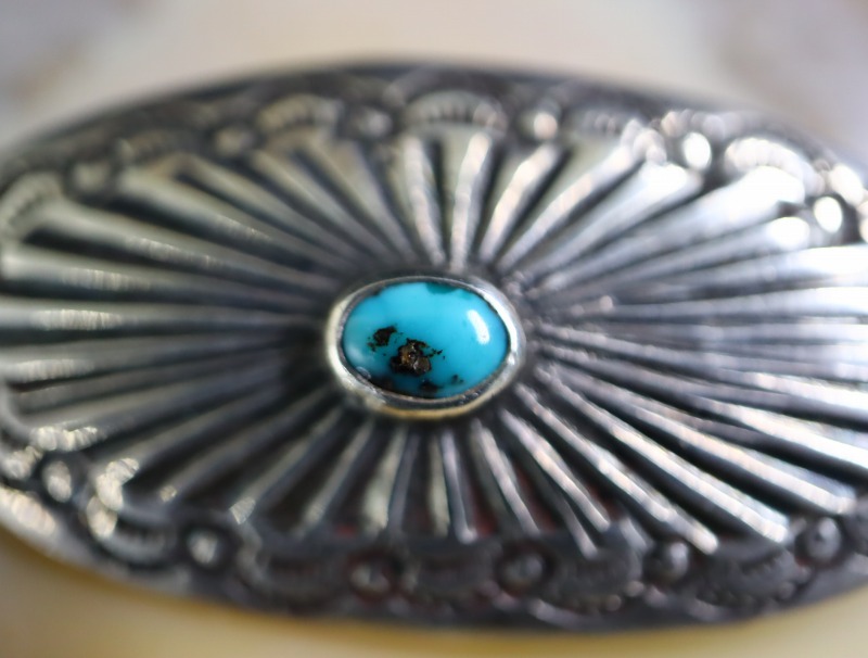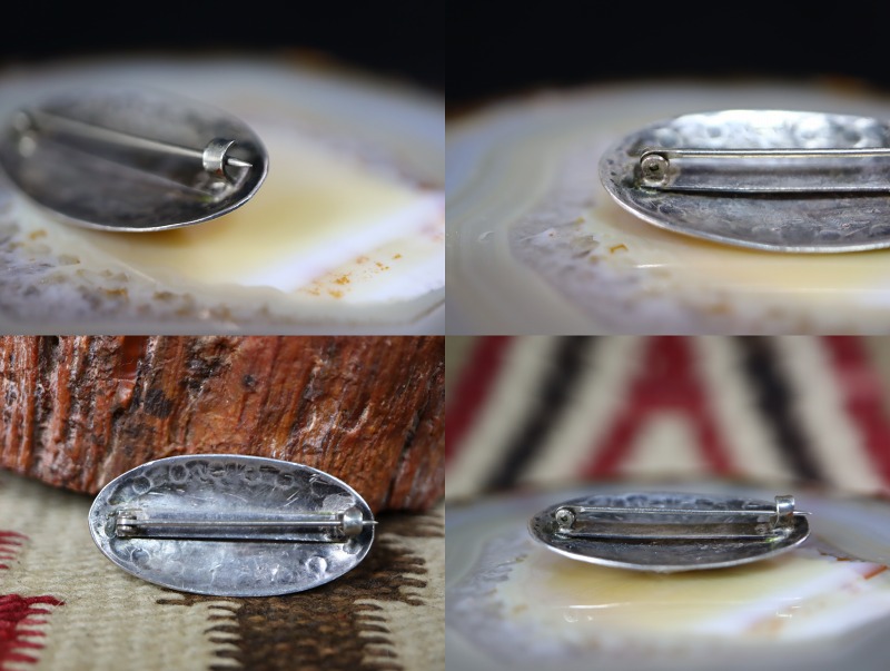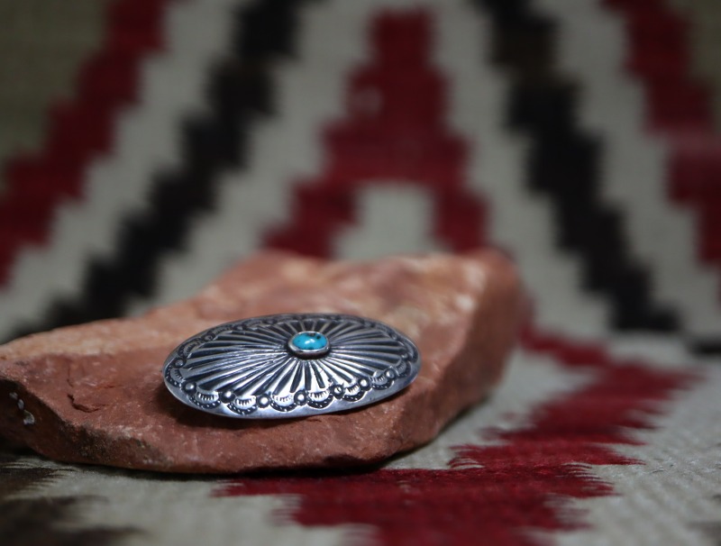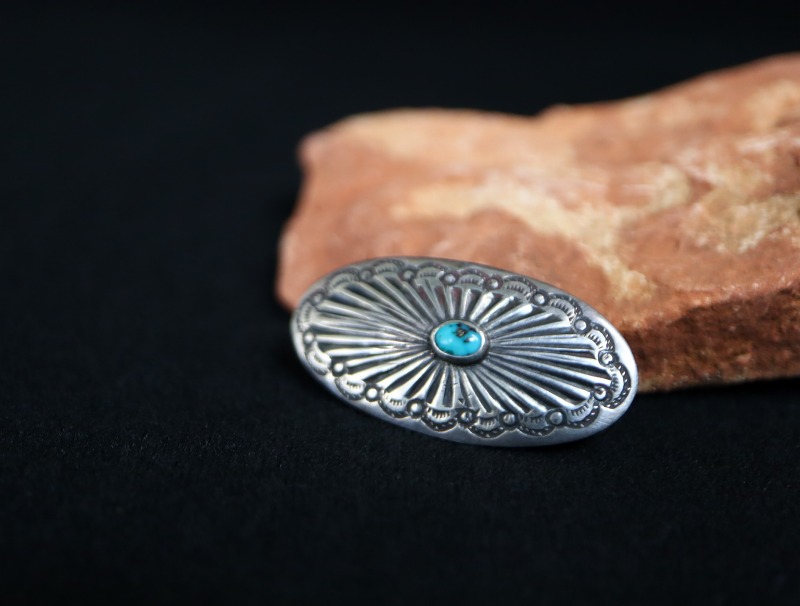 1930年代前後に作られた作品と思われ、独特なオーバルシェイプをべースにバーストデザインのスタンプが象徴的に刻まれた作品。ナバホジュエリーのプリミティブな技術で形作られた小さいサイズのコンチョピンブローチですが、どこか上質感を漂わせ、現在においても新鮮で年代を感じさせない完成度を見せています。