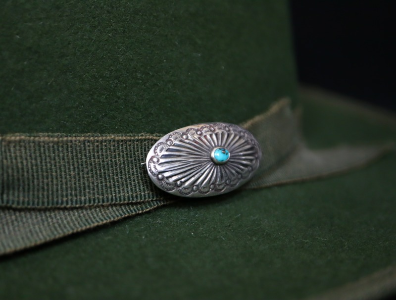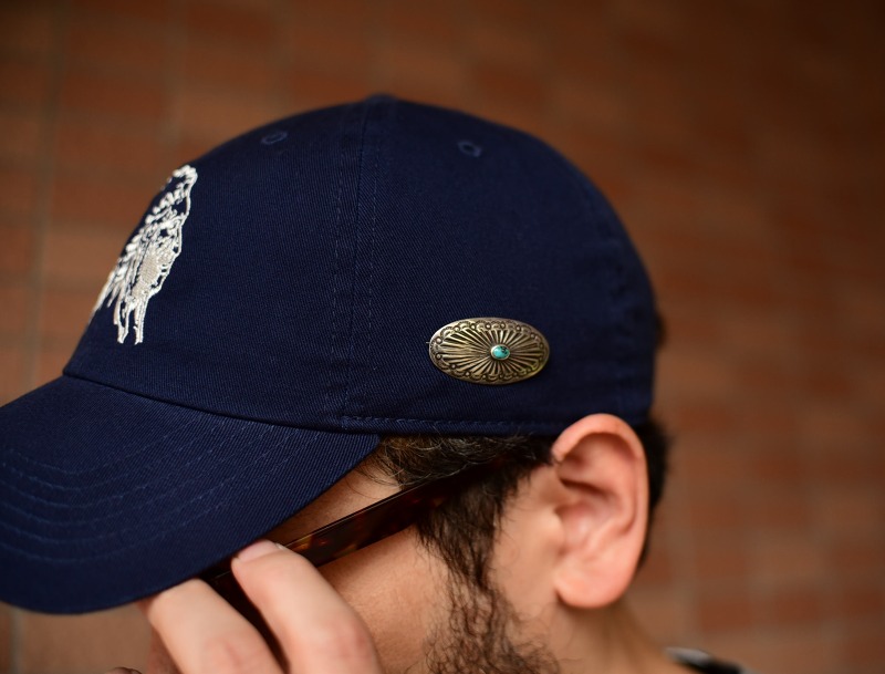 コンチョを元にしたピンブローチの為、性別やスタイルを問わず多くの場面にフィットさせることが可能で、日常の効果的なアクセントとなってくれる作品です。ラペルや胸元にもフィットしますし、ハット・キャップ等のワンポイントにも使い勝手の良いピースです。