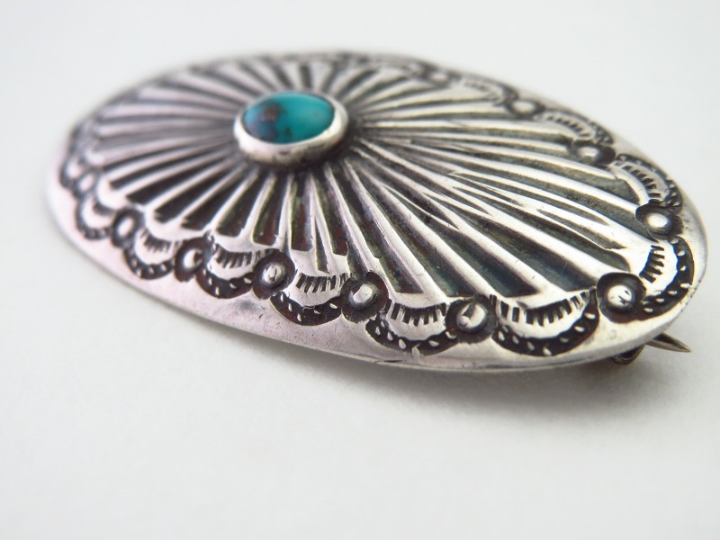 【NAVAJO】ナバホのアンティークジュエリー、バースト(放射状)のスタンプが力強く刻まれたオーセンティックなコンチョをベースとした作品。武骨な印象のシルバーワークで構成されていますが、美しいターコイズなどにより独特な上質感も与えられた小さなアンティーク/ビンテージピンブローチです。