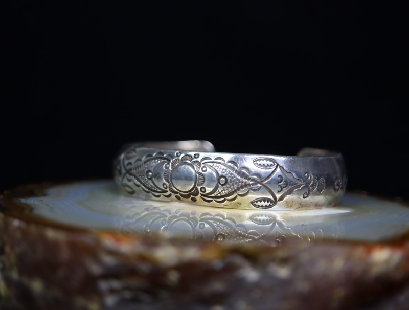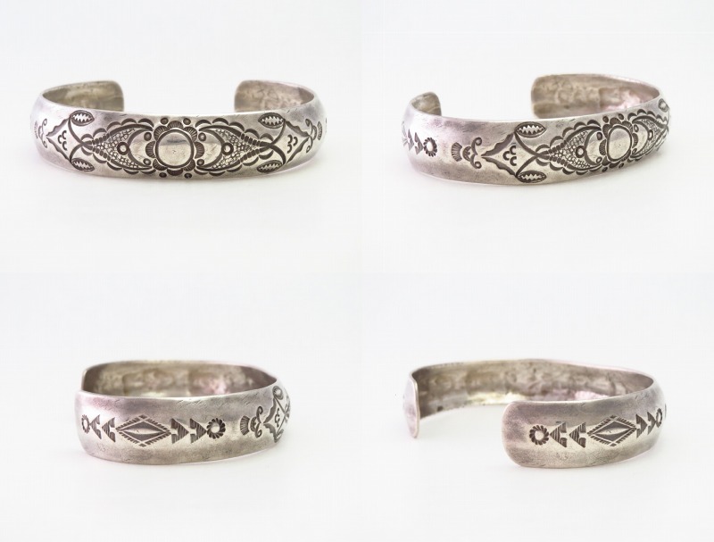 コインシルバーのインゴット(銀塊)から成形された地金をベースに、とても独創的なスタンプワークが施された作品です。それは、狩猟民族を起源とするナバホ族とは異なった文化や価値観を持ったサン・イルデフォンソプエブロの美意識が反映されたデザインと思われ、どこか柔らかで繊細な印象を受けるスタンプワークです。一つ一つのスタンプ(鏨)は、ナバホジュエリーと共通したデザインを刻んでいますが、その構成により全く異なったイメージを生み出しており、Awa Tsirehの独創性も感じ取ることが出来ます。また、中央に配されたフラワーの様なモチーフの両サイドには、とても小さな〇を刻むスタンプ(鏨)をランダムに重ねて打ち込むことで、独自のテクスチャーを生み出しています。このようなディテールは、ナバホの名工【Thomas Curtis Sr.】トーマス・カーティス(1945-2013)や、同じくナバホの有名作家である【Ernie Lister】アーニー・リスター氏の作品においてみられる技術・技法ですが、本作の様なアンティーク作品では他に類を見ないディテールです。本作1点のみでその発祥をAwa Tsirehと断定することは出来ませんが、検証価値のあるディテールです。