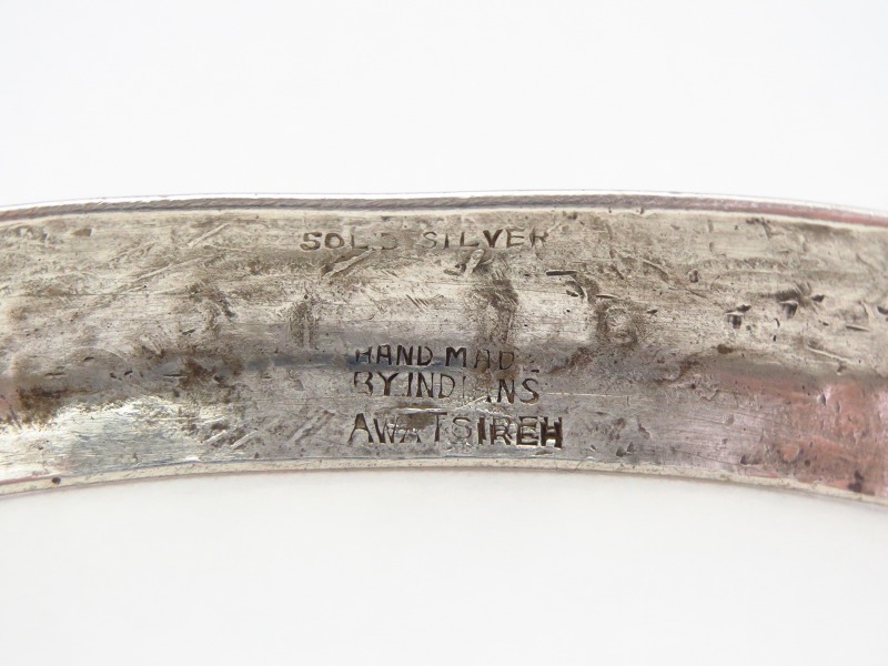 内側に刻印されている『SOLID SILVER HAND MADE BY INDIANS』の表記により1930年代頃に同トレーディングポストで作られた作品と判断でき、さらに作者個人のホールマーク『AWA TSIREH』の文字が刻印された非常に史料価値の高いミュージアムクオリティーを有するブレスレットになります。