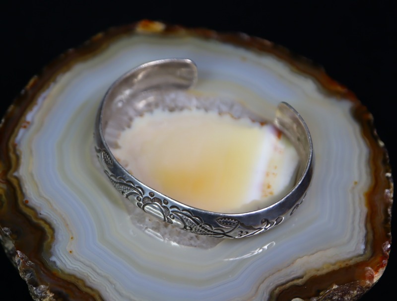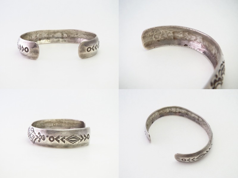 【San Ildefonso】サン・イルデフォンソプエブロの偉大な作家【Awa Tsireh】アワ・シーディ(1898-1955)が、インディアンクラフトショップ【GARDEN OF THE GODS TRADING POST】ガーデンオブザゴッズトレーディングポスト在籍時に制作した作品。ドーム型に成形されたバンド(地金)が特徴的で、ナバホジュエリーでは類を見ないスタンプワークの構成に偉大な作者のクリエイティビティを感じるアンティーク/ビンテージバングルです。
