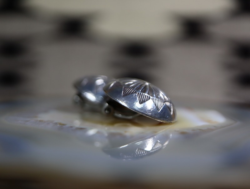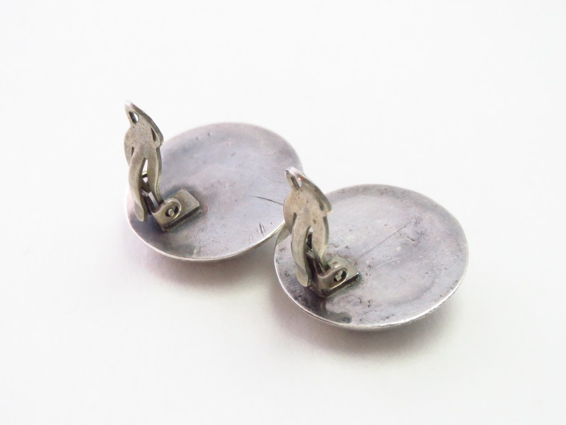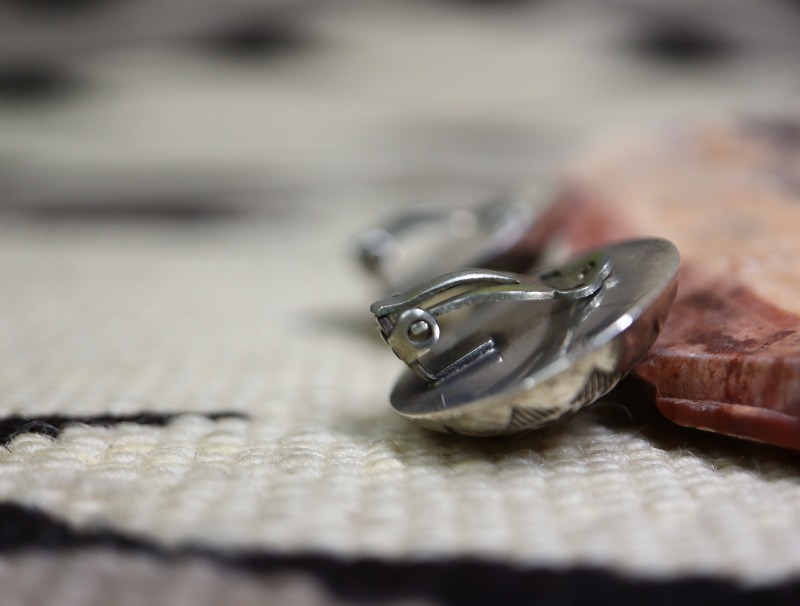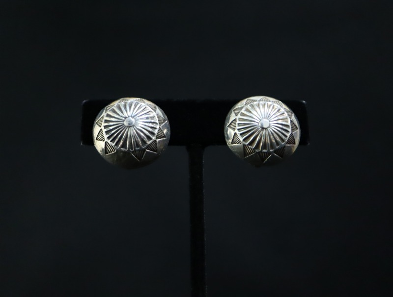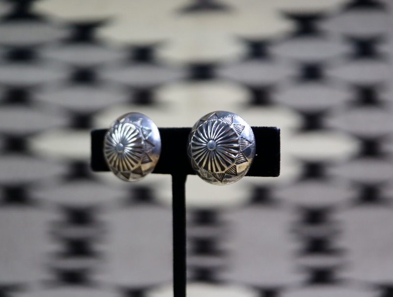 【NAVAJO】ナバホの偉大なシルバースミス兄弟の弟【Ike Wilson】アイク・ウィルソン(1901-1942)とその妻【Katherine Wilson】キャサリン・ウィルソン、又は兄である【Austin Wilson】オースティン・ウィルソン(1901-1976)による作品と推測されるピース。素晴らしいクオリティのスタンプワークが刻まれた立体的なドーム型のコンチョをクリップタイプのイヤリングに構成した作品です。
