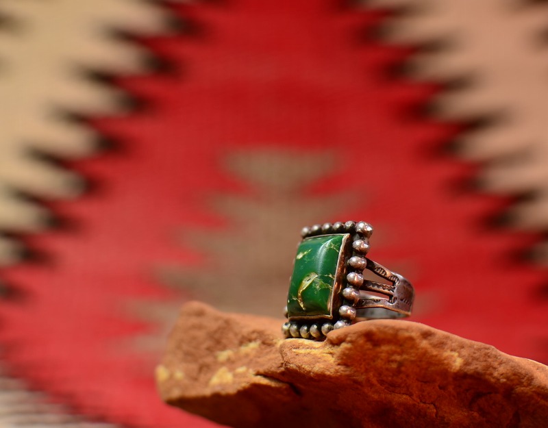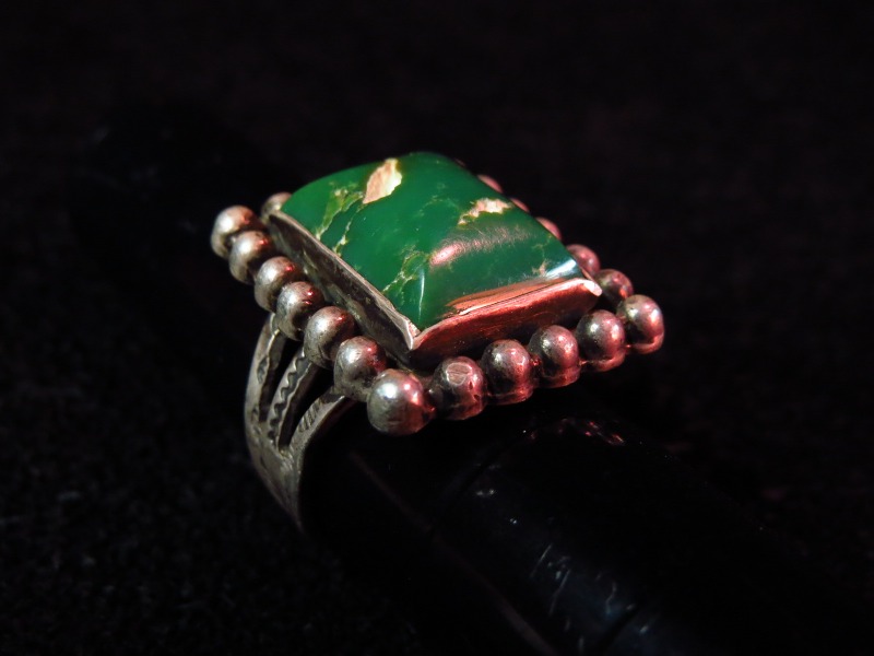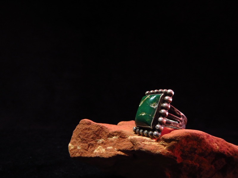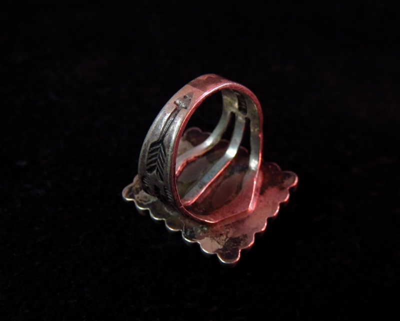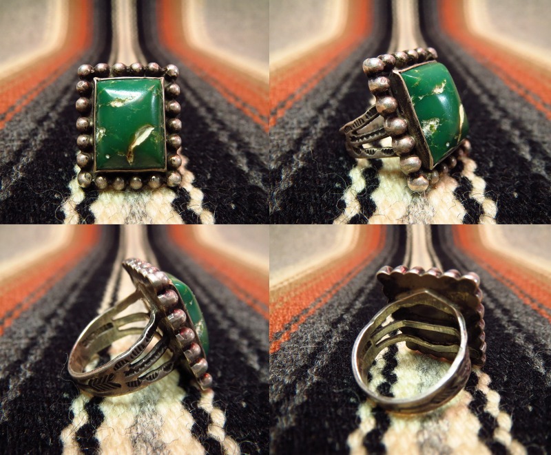 スクエアカットで高さのあるグリーンターコイズがセットされ、ベゼルはシルバードロップで囲む迫力のある造形です。 シャンクはフレッド・ハービースタイルらしいアロー等のスタンプワークが施されアンティーク独特の雰囲気が堪能できる作品です。