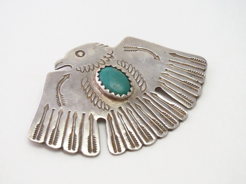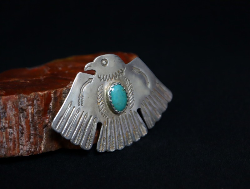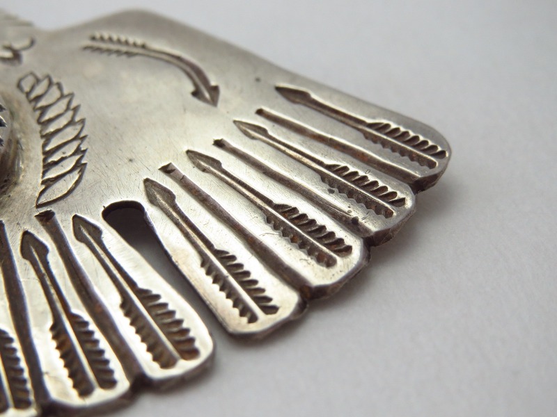硬くしっかりとしたコインシルバーのインゴット(銀塊)から成形された地金から、細かく丁寧なカッティングワークによって端正なサンダーバードのシェイプが切り出されています。そこに、力強く大胆なスタンプワークによってサンダーバードの細部が描き出され、両翼のカーブドアローや、羽の細部も表現している連続したアローのスタンプ等は、非常に秀逸で作者の感性を味わえるディテールとなっています。さらに、頭部の細かなファイルワーク(鑢で削る技術)による立体的なアクセントや、羽先の動きのあるカッティング等、細部にも繊細なシルバーワークが施されることで作品の完成度を高めています。