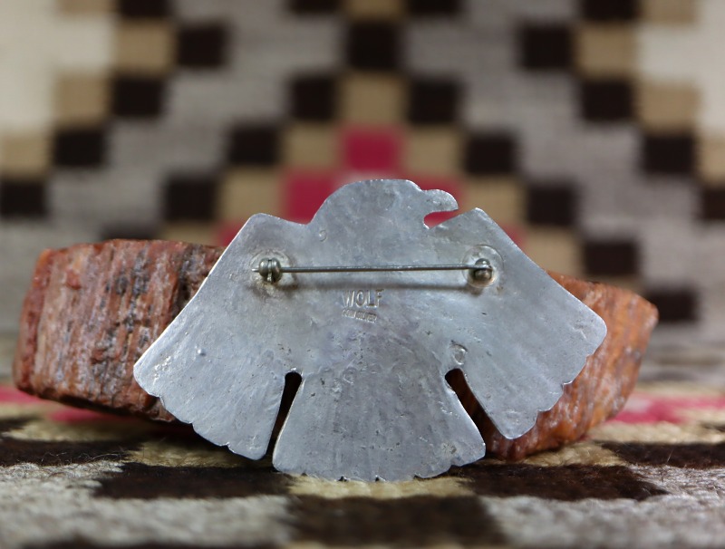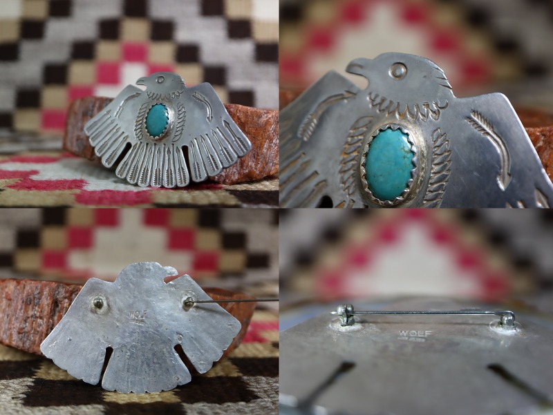 裏側に施された「WOLF」のホールマークから、同作者のキャリア後半に作られた作品と推測され、1950年代~1960年代に制作されたものと思われます。モチーフやシルバーワークには、トラディショナルなナバホスタイルを踏襲しながらもWolf-Robeらしい突出したデザインセンスを感じさせ、高い史料価値を有する作品となっています。