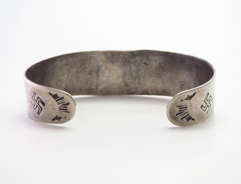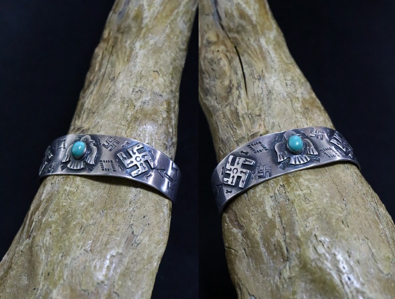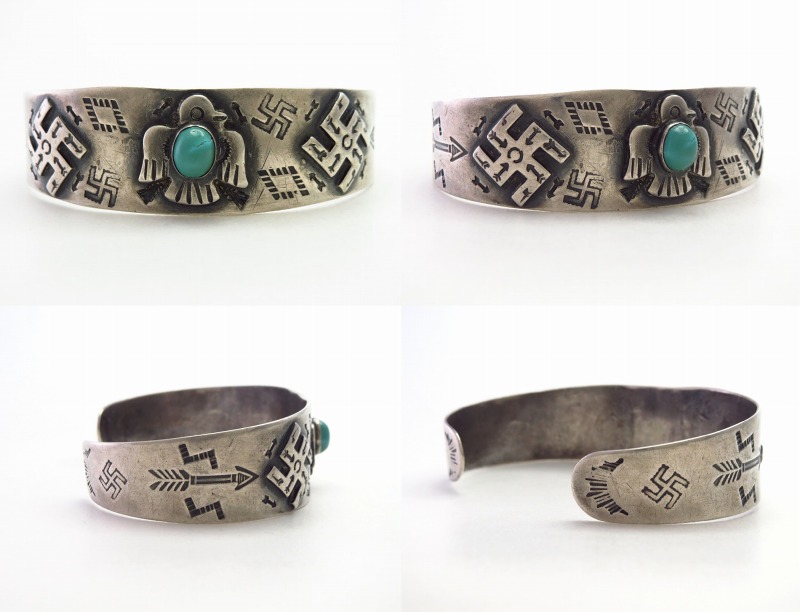 1920年代末頃~1930年代製で、おそらくコインシルバー(銀含有率90.0%)の地金から作られたバンドをベースとしています。そして、ツーリストジュエリーやフレッド・ハービースタイルを代表するモチーフである、サンダーバードと逆卍のアップリケをメインに構成され、中央には小さなグリーンターコイズもマウントされています。