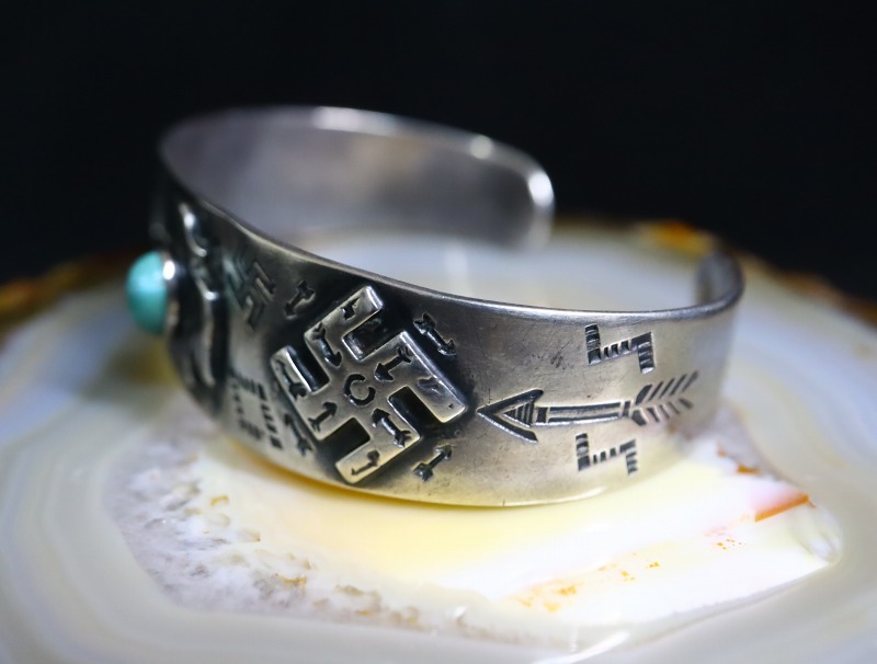 そして、それぞれに細かなスタンプワークが力強く刻まれており、卍だけで4か所、小さなアローは総数20か所も刻まれております。また、その構成も左右非対称の凝ったデザインとなっており、どこか楽し気でツーリストジュエリーらしい魅力を強調するディテールとなっています。ツーリストジュエリーのオーセンティックなモチーフや構成となっていますが、それらの中では比較的しっかりとした造りのピース。さらに、バンドのサイドからターミナル(両端)にかけてもアローや卍等のスタンプワークが配され、見所の多いブレスレットに仕上げられています。