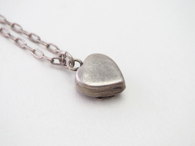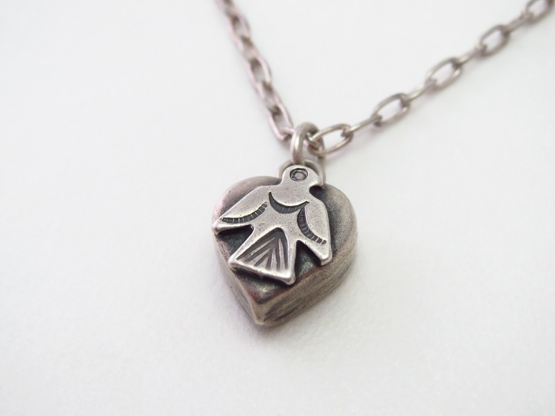 1930年代後半~1950年代頃に作られたピースと思われ、小さくも厚みのあるフォルムも可愛いハート型に、スタンプワークが刻まれたサンダーバードがアップリケされており、アンティークジュエリーながらフレッド・ハービースタイルらしいキャッチーな雰囲気を持っています。一部の工程には機械が用いられており、マシン&ハンドメイドのハイブリッドなピースですが、現在では現存数の非常に少ない貴重なアイテムとなっています。
