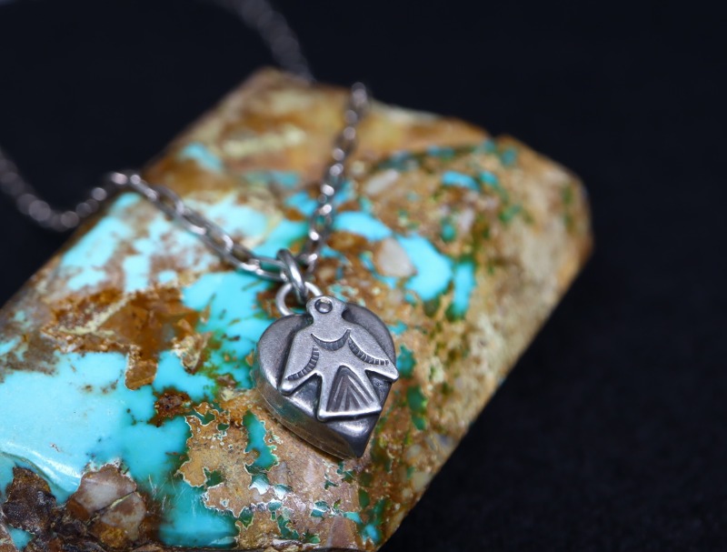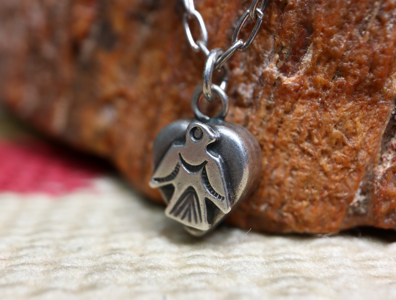 【Tourist Jewelry】ツーリストジュエリーや【Fred Harvey Style】フレッド・ハービースタイルとも呼ばれる20世紀前半頃に観光客向けに制作されたスーベニアアイテムの一つ。ハート型をベースとしたとても珍しいトップに、アイコニックなサンダーバードがアップリケ/パッチワークされています。小さなサイズも含め愛らしい印象のアンティーク/ビンテージネックレスとなっています。