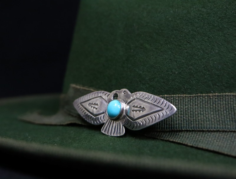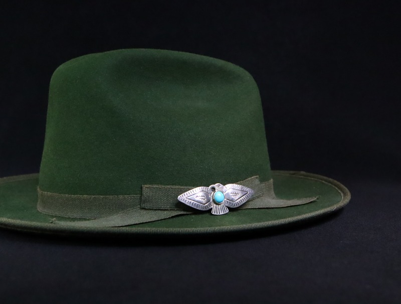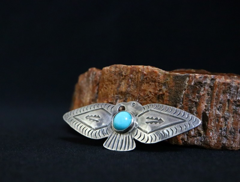 こちらの作品もすべてのディテールがプリミティブでオールドナバホジュエリー独特の技術で作り上げられています。その為、武骨なシルバーワークとサンダーバードというキャッチーなモチーフとのコントラストやギャップも楽しめる作品であり、アイコニックなモチーフは、男性向けのアクセサリーには重要な要素である『遊び心』を与えてくれるアイテムです。