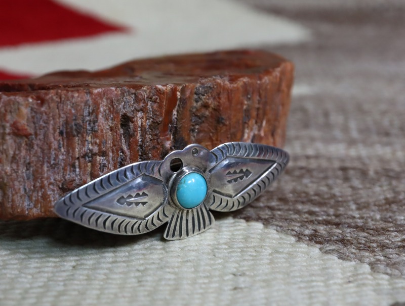 【NAVAJO】ナバホのアンティークジュエリー、インゴットシルバー(銀塊)から成形されたサンダーバードシェイプをベースとし、穴を使ったディテール等も特徴的な作品。中でも当時サンタフェに在った【Julius Gan's Southwestern Arts and Crafts】で制作されたと思われる個体で、シンプルながら素晴らしい造形センスとハンドメイドの質感が特徴的なサンダーバードシェイプのアンティーク/ビンテージピンブローチです。