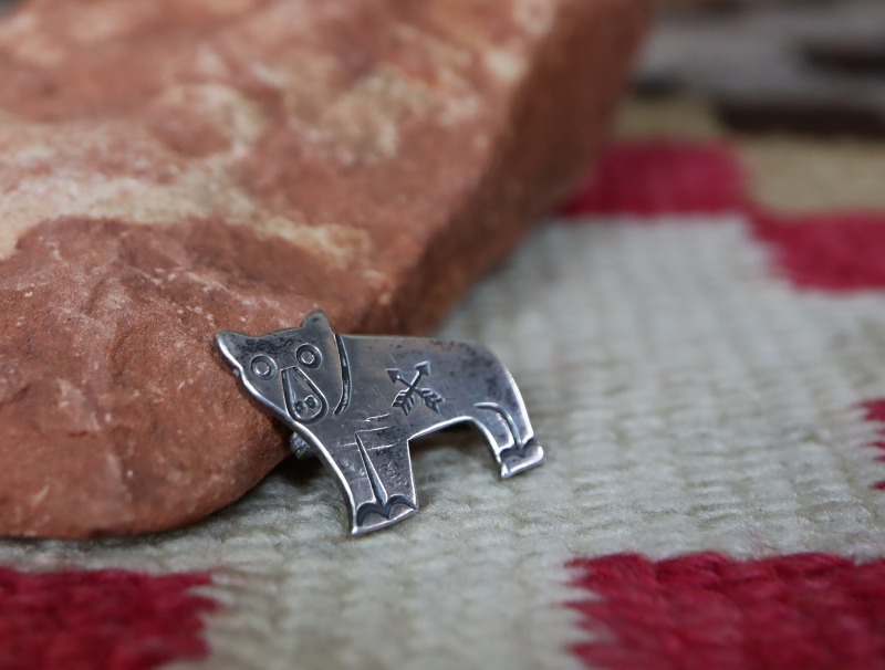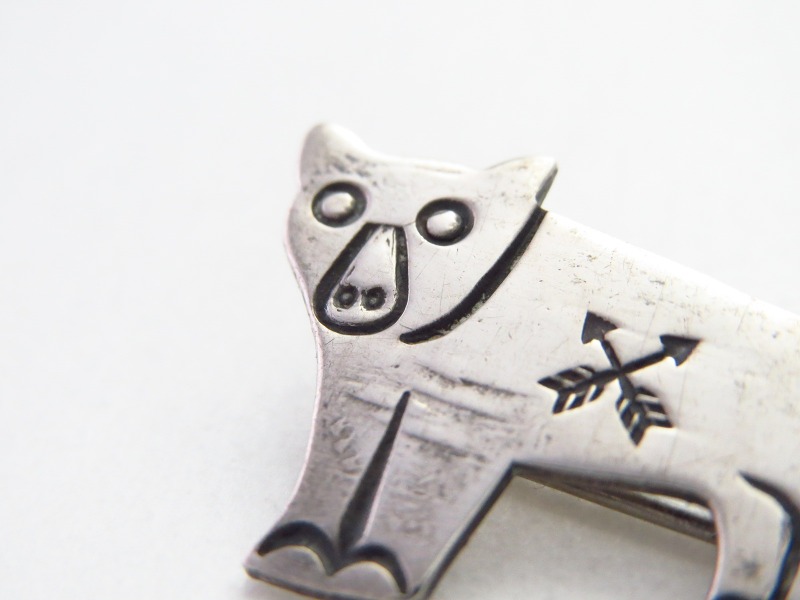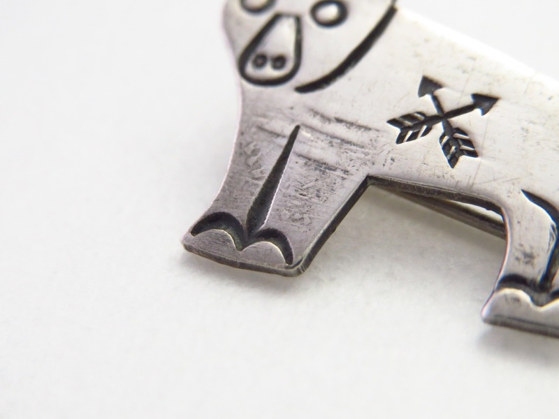 1920年代後半~1940年代製と思われ、実際には大きな熊がとても小さく可愛い印象に造形されています。スタンプワークが刻まれることによって細部が描き出され、中央にはクロスアローズの刻印が刻まれることで、インディアンジュエリーらしい表情に仕上げ有れています。ています。