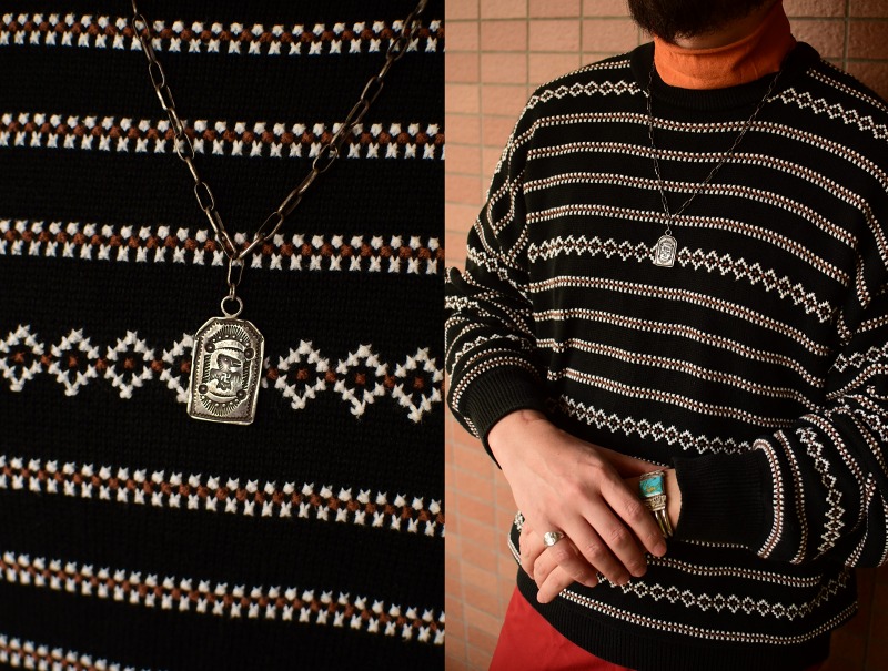 そして『ドックタグ』のような存在感はミリタリーアイテムとの相性も素晴らしく、ターコイズがセットされていないソリッドなシルバーにより、多くスタイリングに馴染みやすいアイテム。