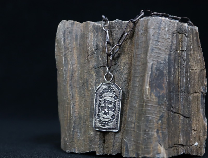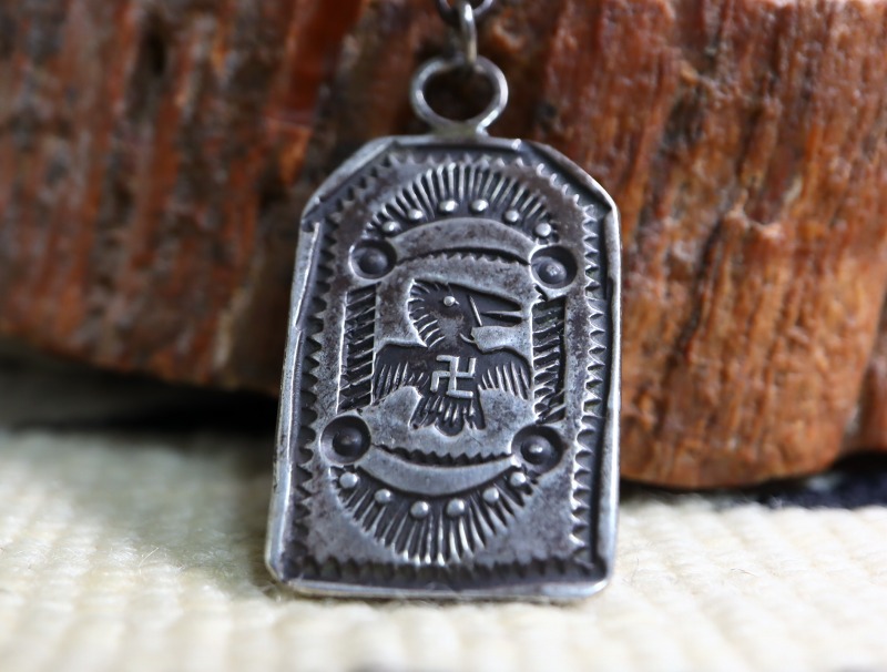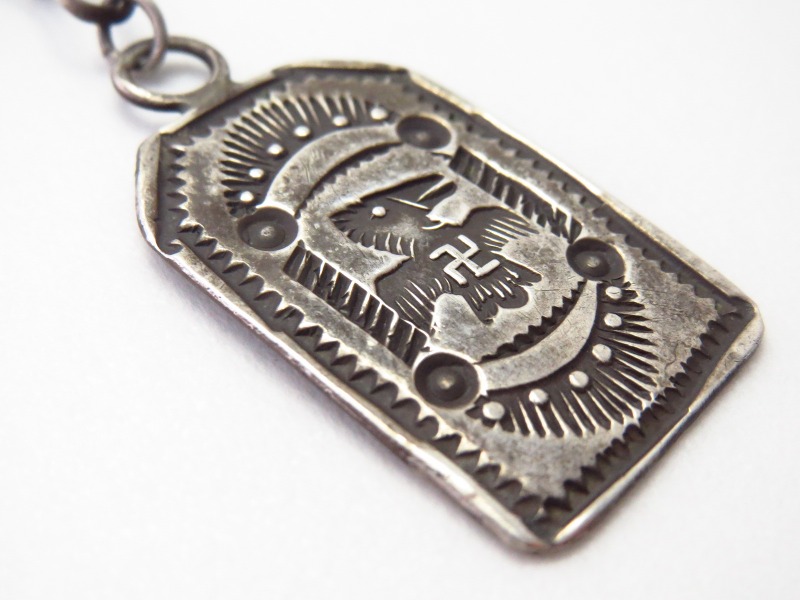 【NAVAJO】ナバホのアンティークジュエリー、インゴットシルバー(銀塊)から成形されたタグをベースに、【卍】Whirling Log/Nohokosの入る、ワイルドで特徴的なサンダーバード等のスタンプワークが施された作品。伝統的なアイテムながら非常に現存数の少ない貴重なアンティーク/ビンテージネックレスです。