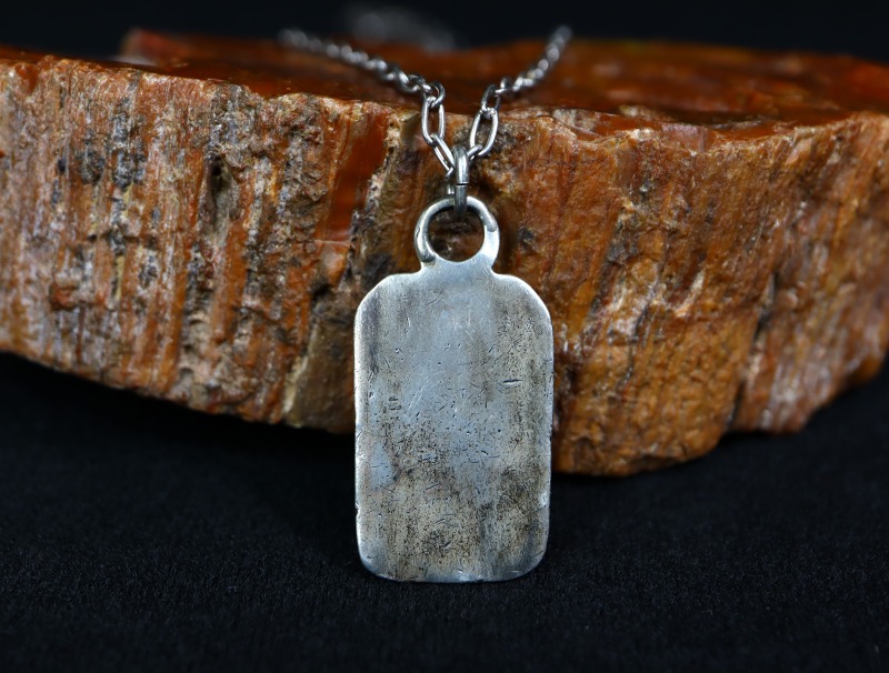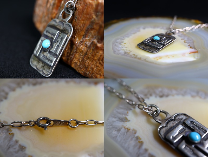 1930年代頃に作られたピースと思われ【Tourist Jewelry】ツーリストジュエリーや【Fred Harvey Style】フレッド・ハービースタイルとも呼ばれる20世紀前半頃に観光客向けに制作されたスーベニアアイテムの一つ。こちらのようなシルバープレートタイプのタグ/タブは、当時のサウスウエスト観光で荷物タグとして使われていたものとされていますが、現在はアクセサリーのパーツとして広く用いられています。