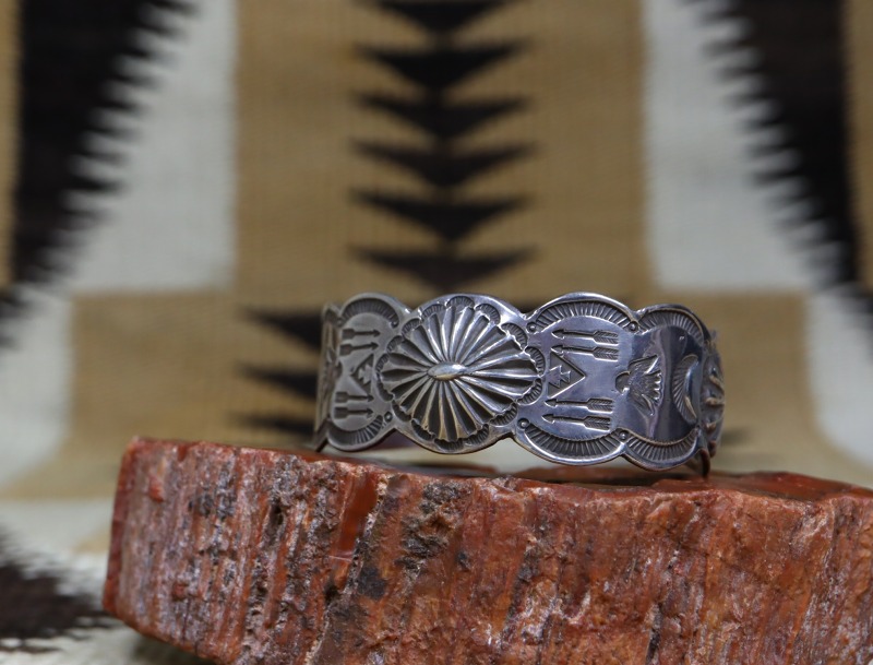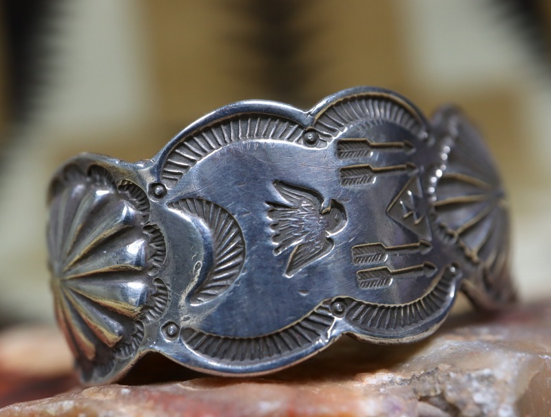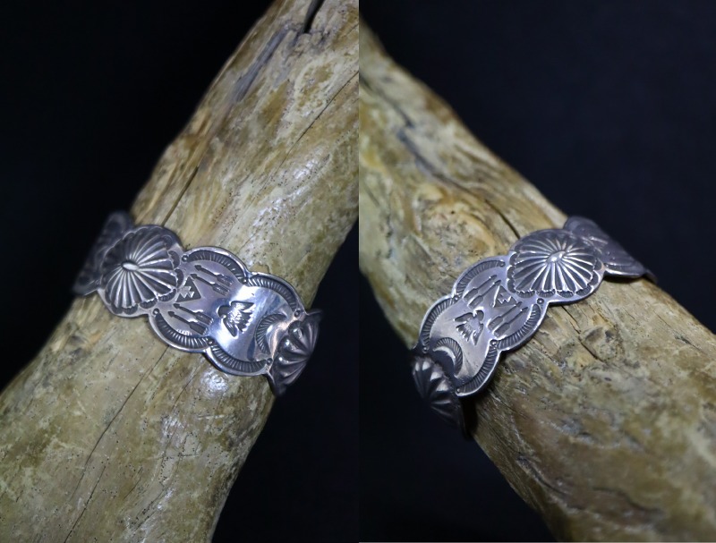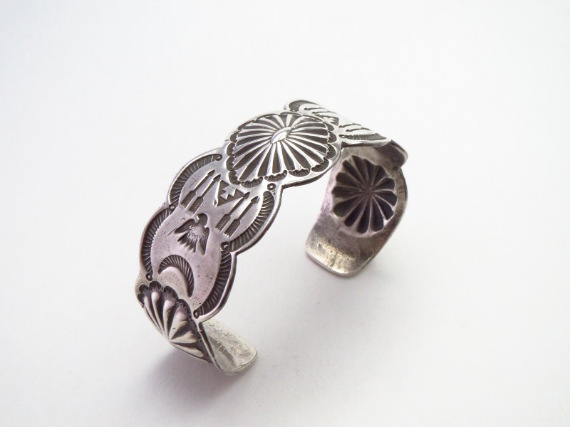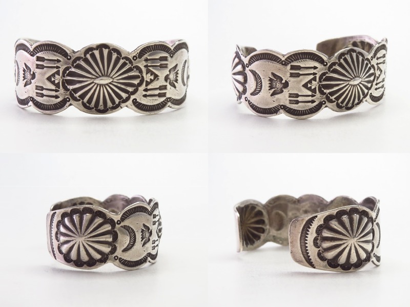 アローやサンダーバードをモチーフとした細かなスタンプワーク等により、ビンテージインディアンジュエリー独特な表情とラフで奥行きのある表情がもたらされていますが、360度どの角度から見ても素晴らしい造形美には、作者の信念や美意識が宿っているようにも感じられます。