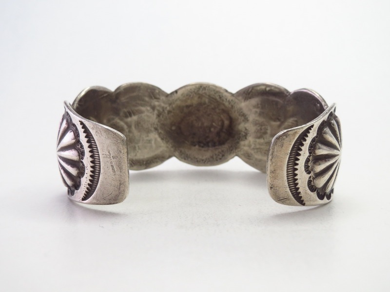 インゴットコインシルバー(銀塊)から成形されたバンド/地金は、心地よい重量感を持ち比較的ワイドな幅に仕上げられています。そして、センターと両サイド付近の3か所にはシェルコンチョのリポウズ/バンプアウトが施されています。このような菊花紋章の様なデザインは、元々はシェル/貝殻を起源としたデザインであり、インディアンジュエリーの最も古いモチーフの一つとなっています。古くから現代まで受け継がれ、多くの場合には本作の両サイドと同様に鏨(鉄製の金型ツール)の凸と凹を用いてシルバーを挟み、叩きだすことで立体的なシェルデザインを浮き上がらせますが、本作の中央に施された菱形のリポウズについては、木(丸太)やレッド(鉛の塊)に施された凹みに、地金となるシルバーをハンマーで叩き沿わせることによってドーム状の膨らみを作り上げており、さらにそこに『チェイシング/Chasing』と呼ばれる鏨を使いシルバーに立体的な角度を付ける(彫刻の様なイメージ)技術とスタンプワークを用いた高度なシルバーワークによって形作られています。